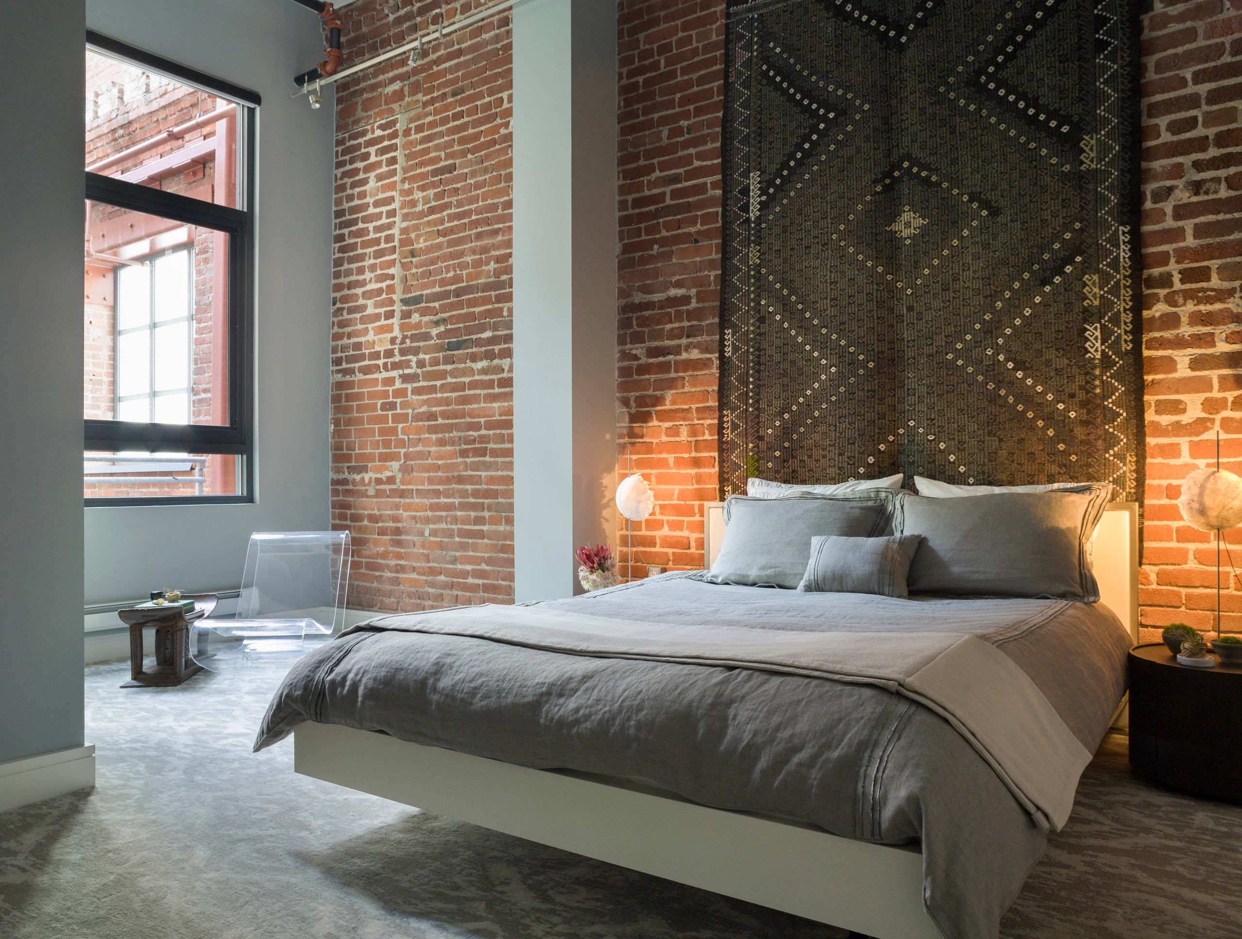 In another over-the-bed move, interior designer Jennifer Gustafson softened a brick wall and brought a high-ceilinged room into scale with a rug.