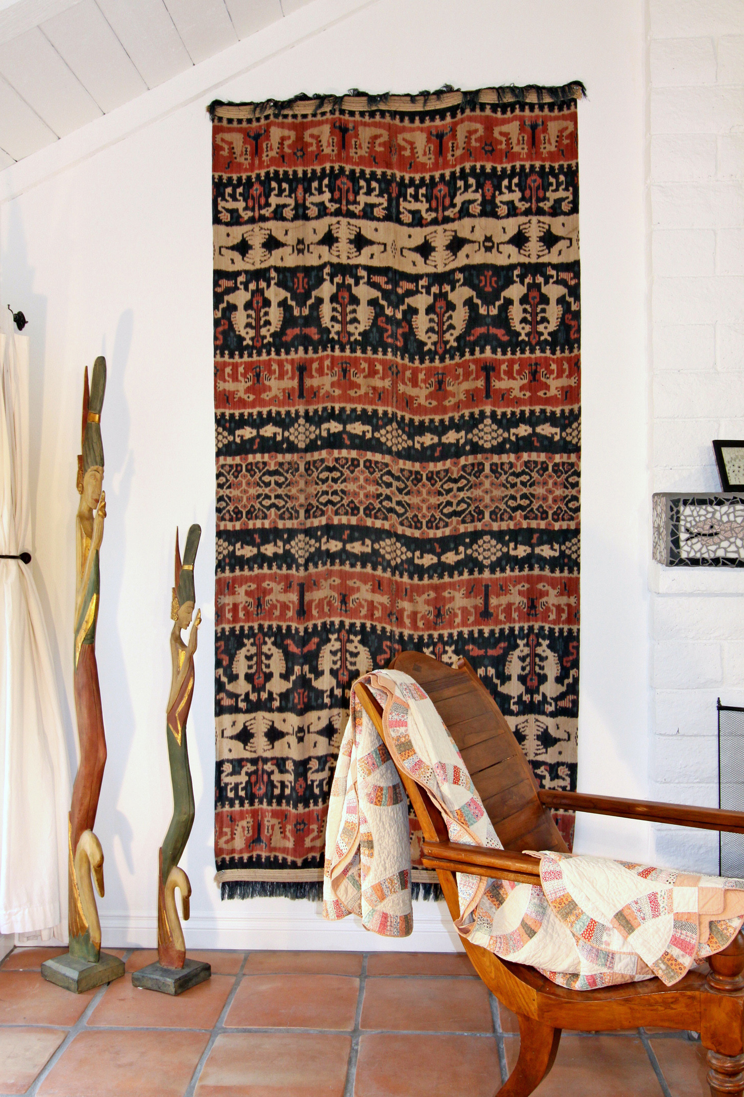 Hanging this rug, an antique from Indonesia, on the wall protects it from wear and tear.