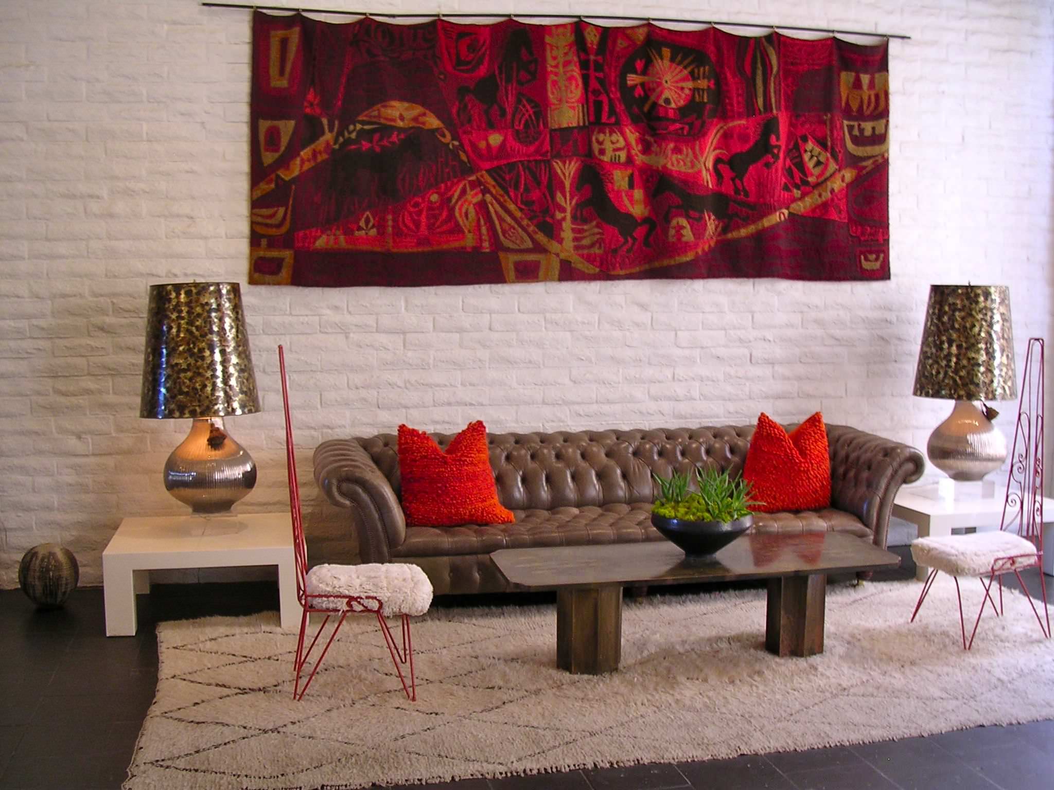 This Moroccan rug emphasizes the long, low nature of the sofa in the Parker Palm Springs hotel.