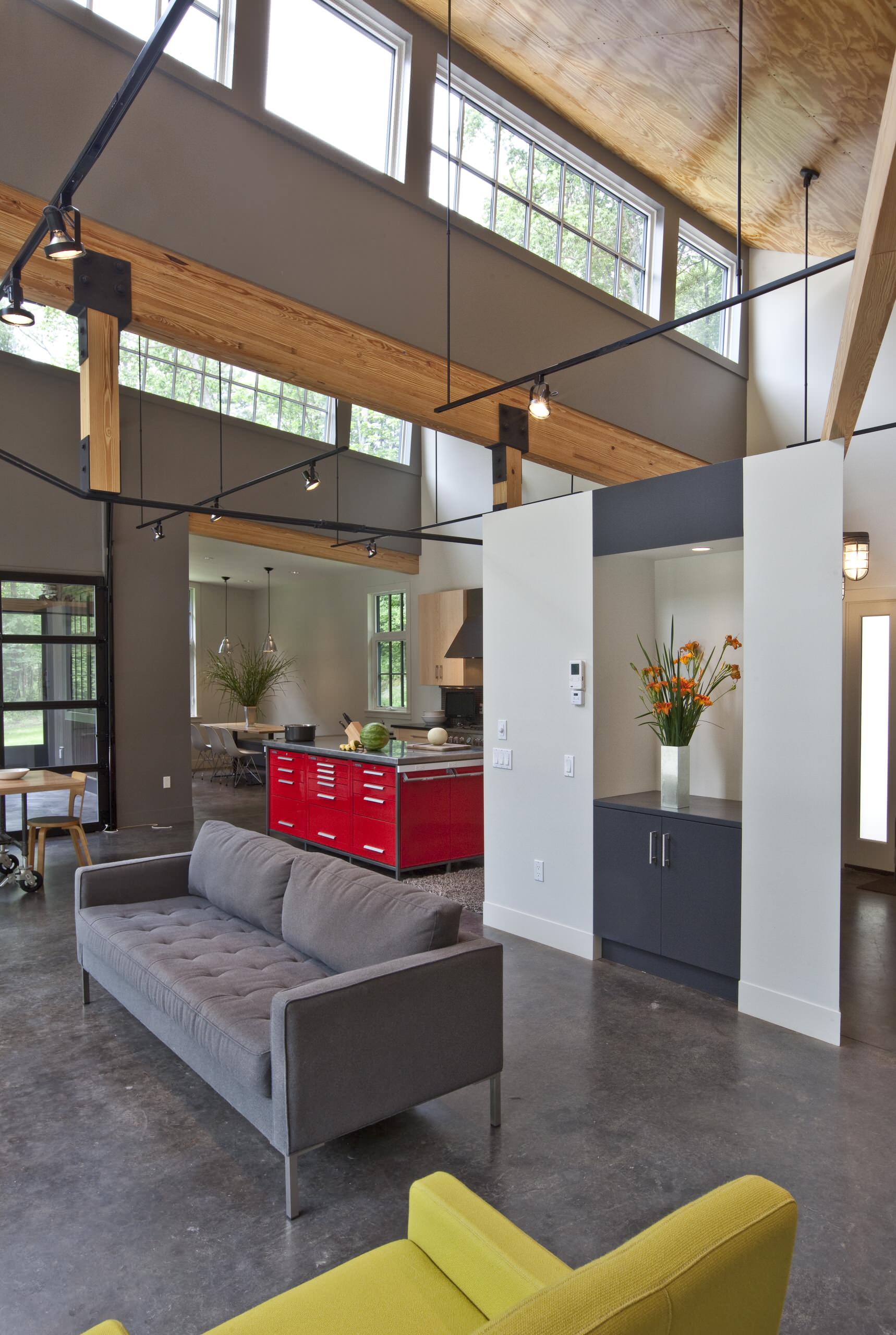 That door is visible on the left side of this photo. In the foreground we can see another clerestory that is independent of an interior partition. The natural light that the clerestories bring into the open space is beneficial, both in terms of reducing energy consumption and increasing quality of life.