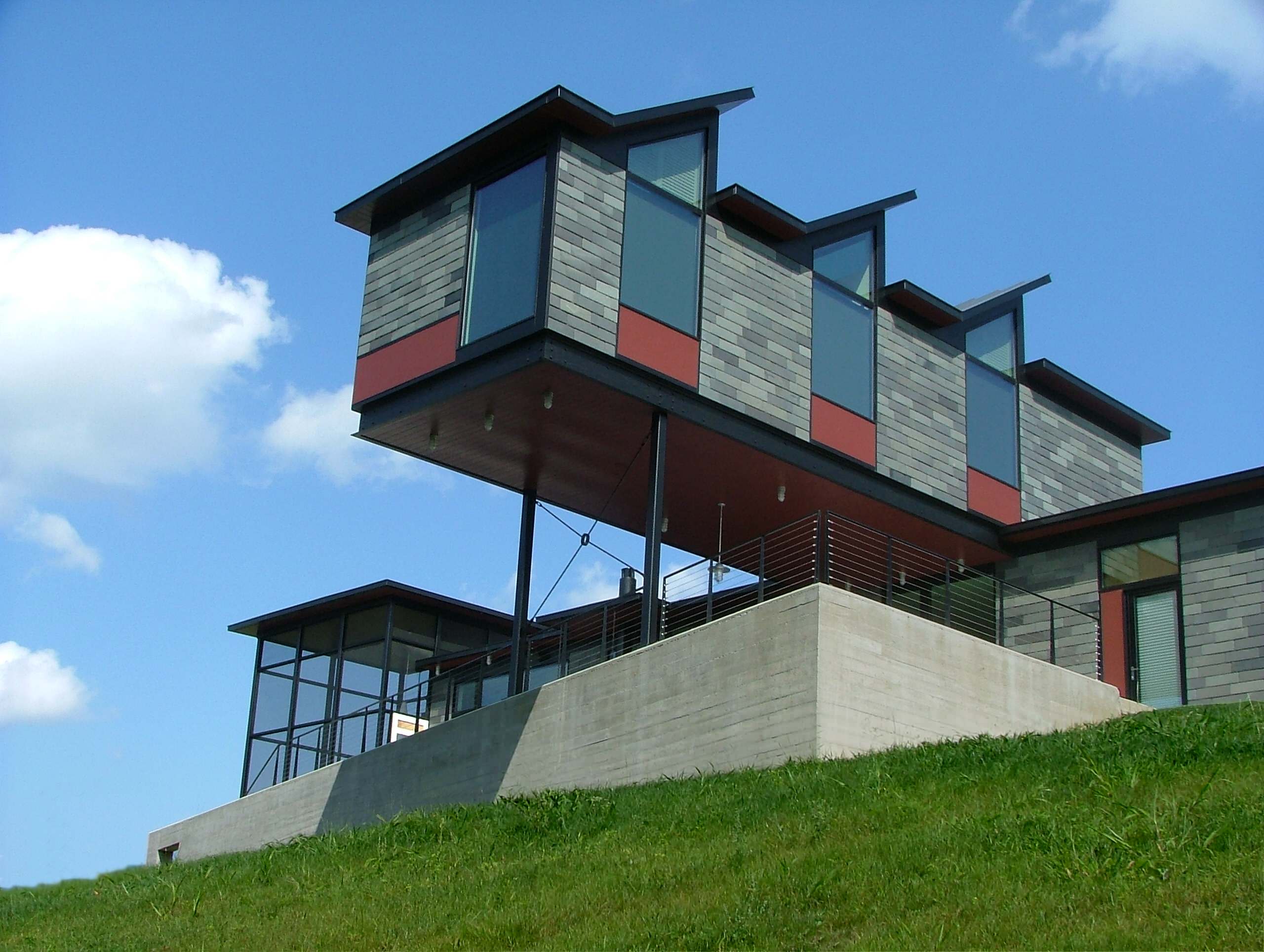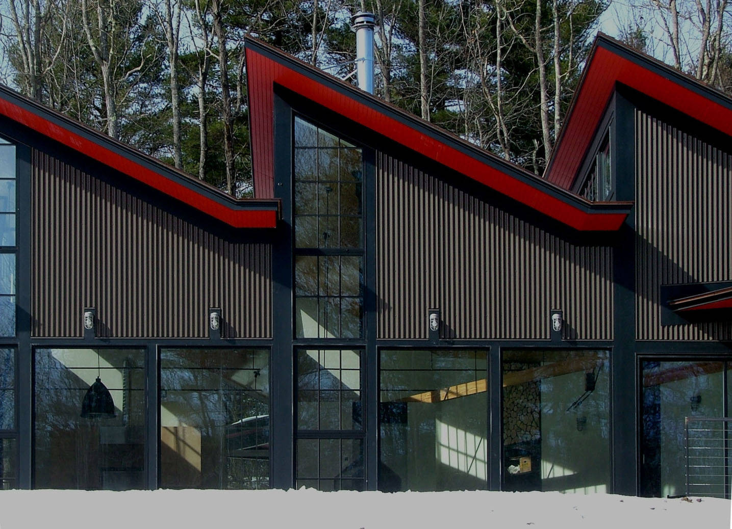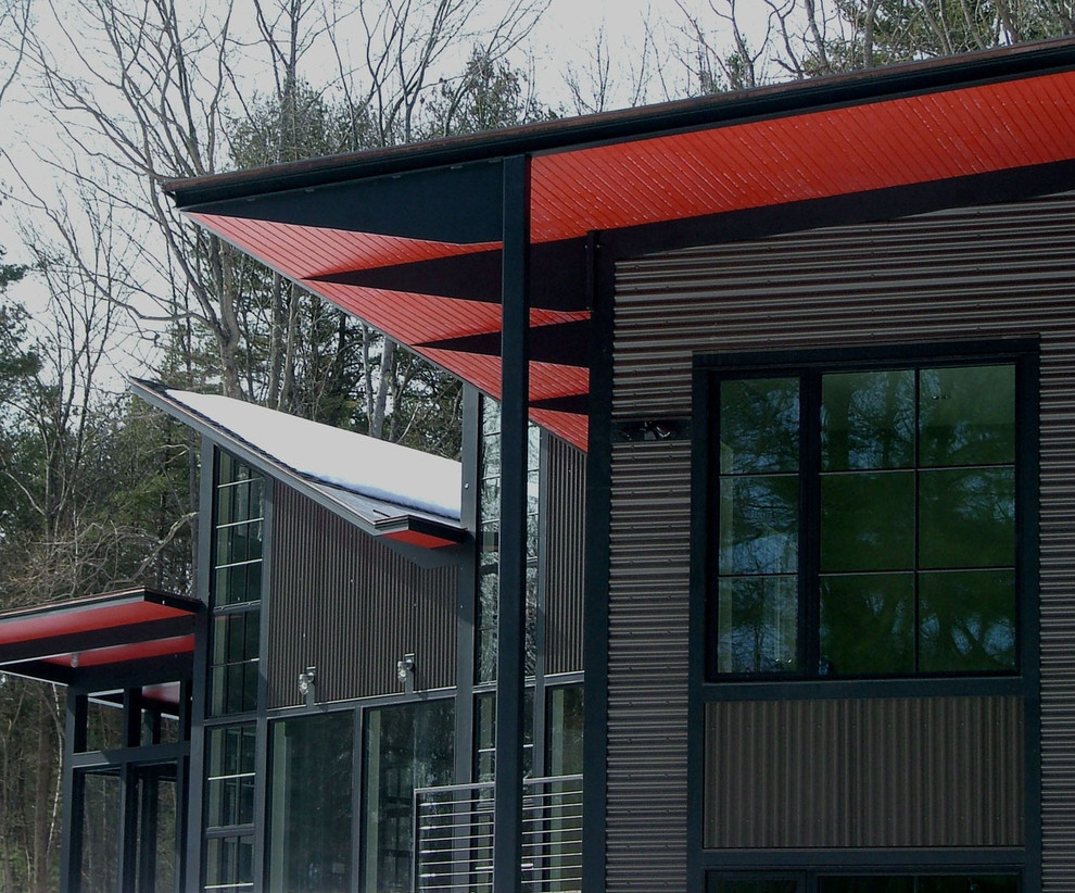 I love the way Burr & McCallum has treated the sloped roofs, painting the eaves a red that contrasts with the brown-gray walls and frames. The red really accentuates the sawtooth form, as if it's the most important part of the house.