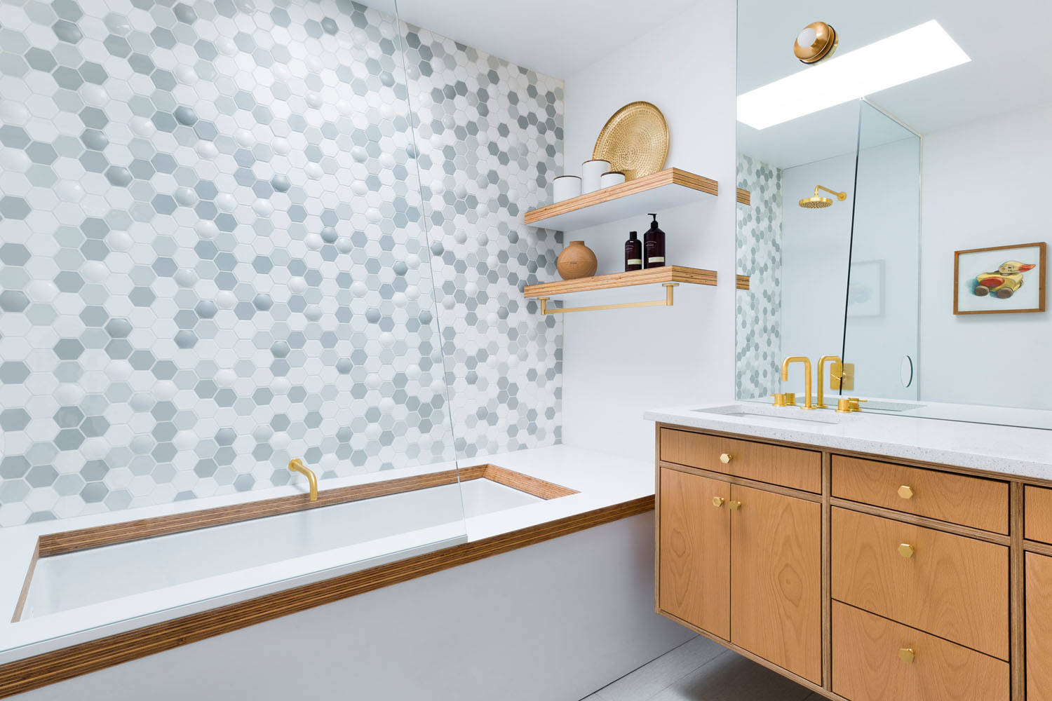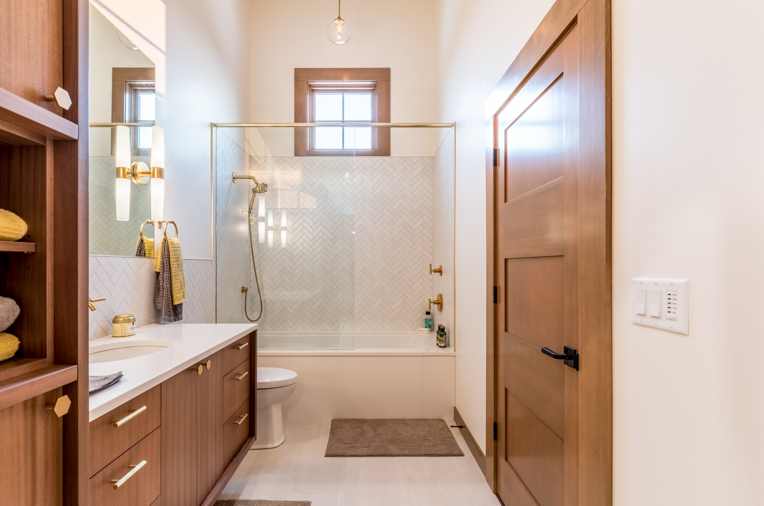 Hardware style. A glass screen or frameless glass door requires little hardware compared with a sliding or framed glass door. Clients often opt to use the same hardware finish as the shower head and tub faucet.