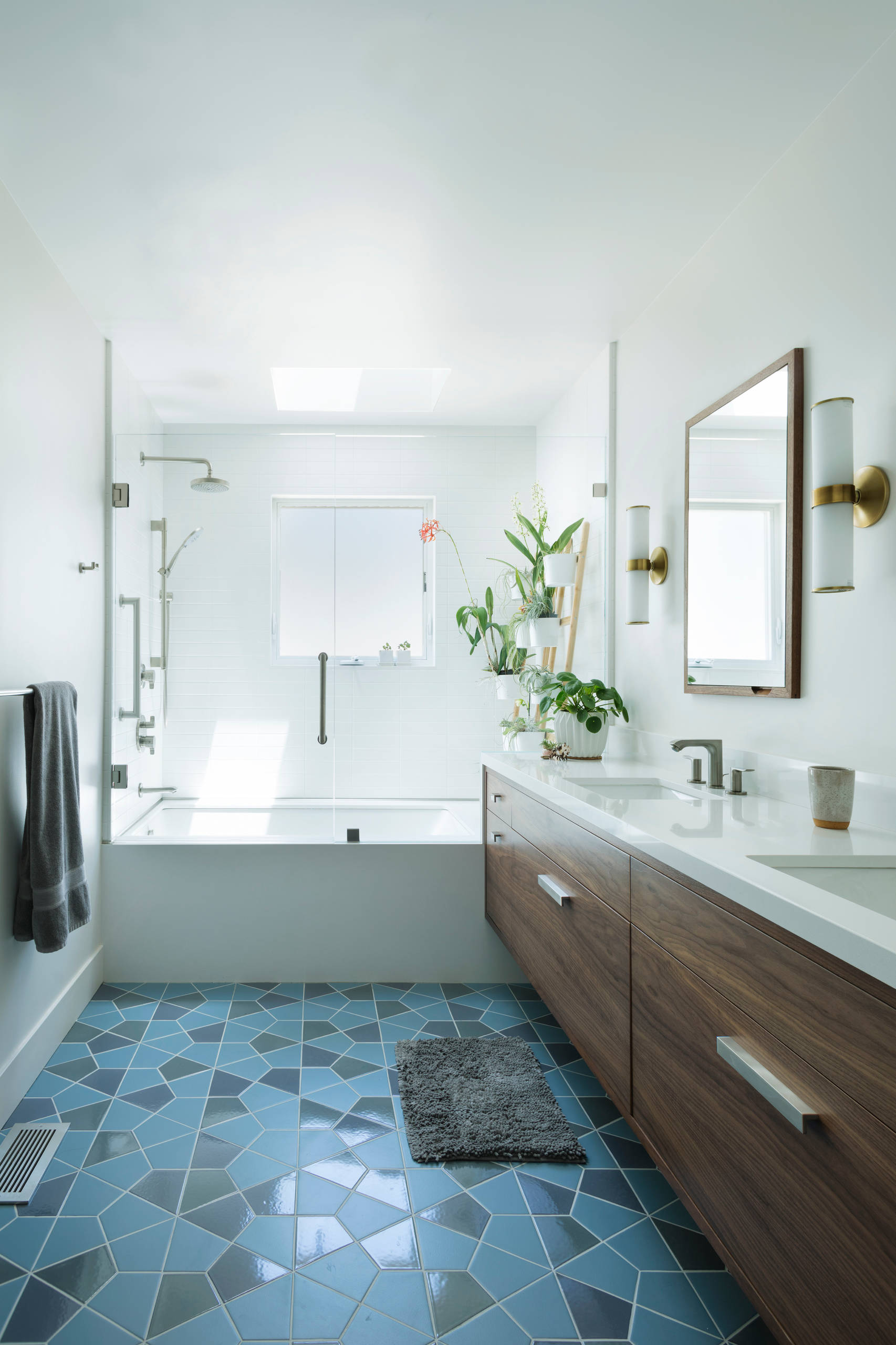 In this bathroom, Jaci Springfield, designer and owner of Springfield Design, used a glass panel with a door that swings out because it fit the room’s contemporary feel and makes the tile in the shower a focal point. The swinging door allows better access to the water controls.