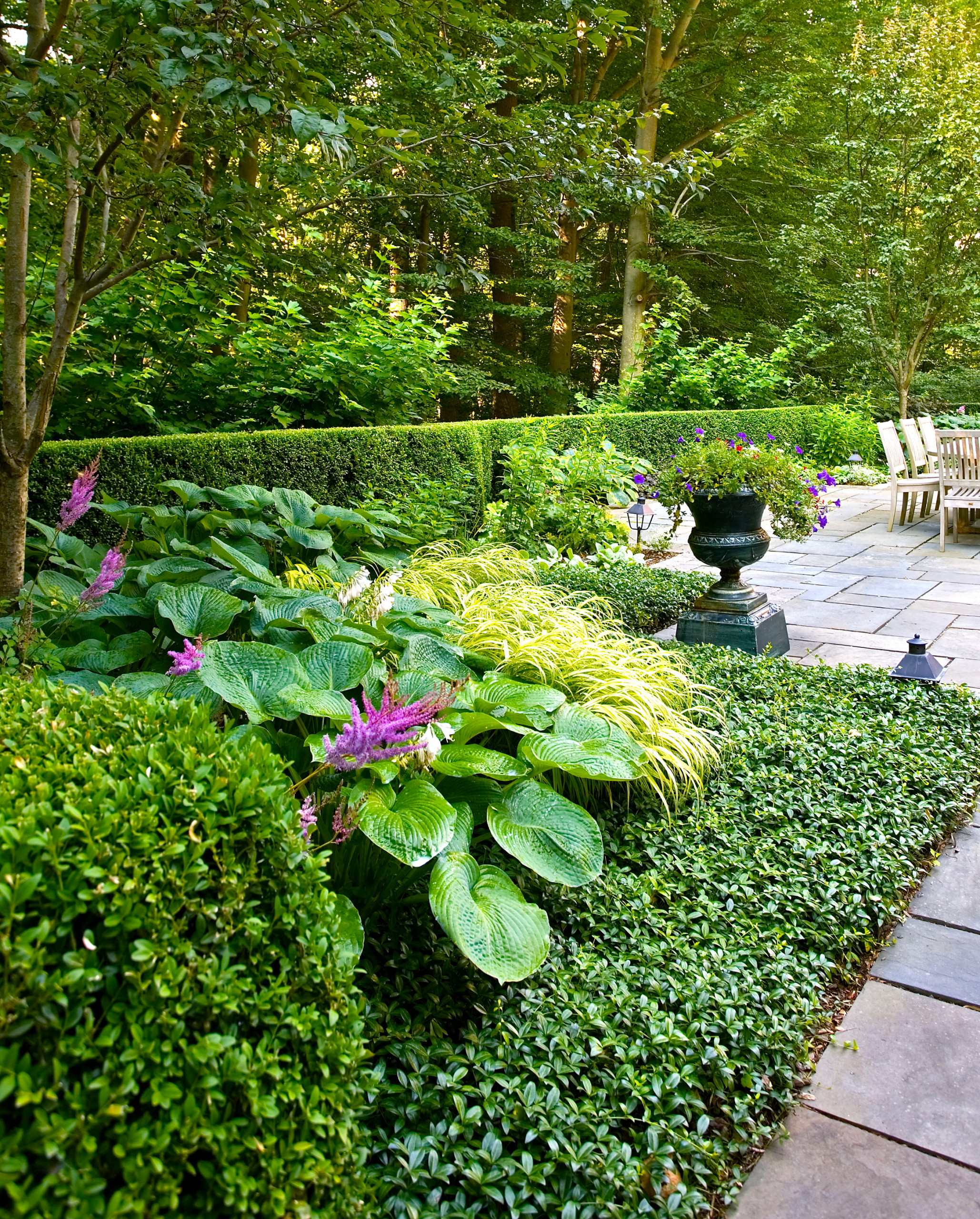 Robust vines with woody stems are the easiest to establish as ground covers. Carolina jessamine (Gelsemium sempervirens), which is native to the southeastern U.S., makes a dense evergreen ground cover. Common periwinkle (Vinca minor) fills out around Hosta ‘Lady Isobel Barnett’ in this New York garden.