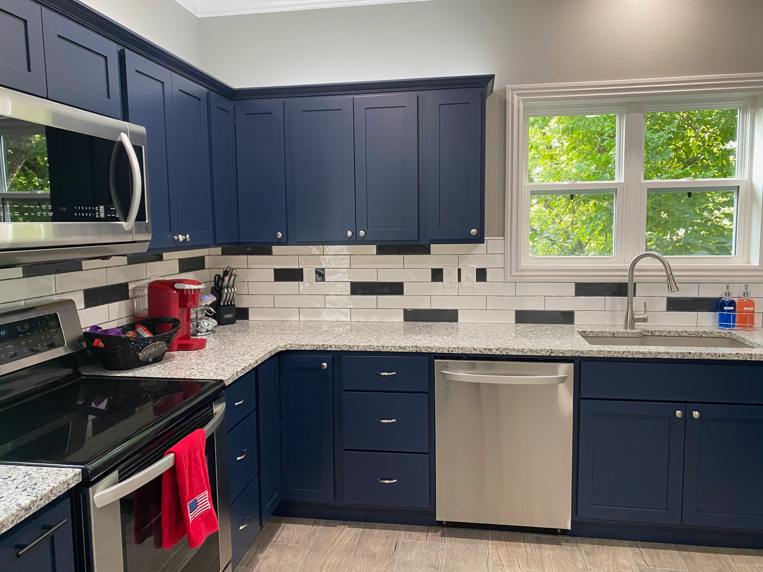 Project details: Blue and red accents and design details are thoughtfully integrated throughout the interior for a patriotic feel. “I utilized Houzz early in the conceptual stage and throughout to get floor plan and design ideas,” Daniel says. “Pictures of cabinets on Houzz sold me on the navy blue we chose to use for our cabinets.”