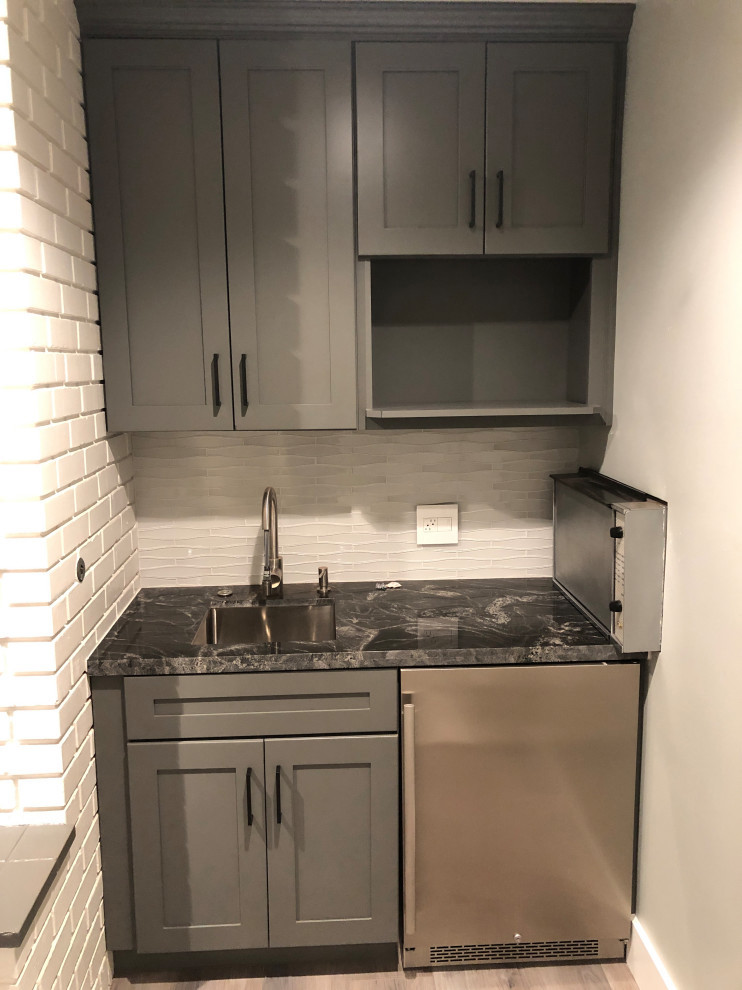 This compact kitchenette features the original two-burner stove and a repurposed bar countertop, plus a compact Avallon refrigerator bought on Houzz. The family uses an additional refrigerator in the garage to store extra food. “We barbecue a lot too,” Jacy says. “It’s been interesting figuring out what all we can do in the small space.”