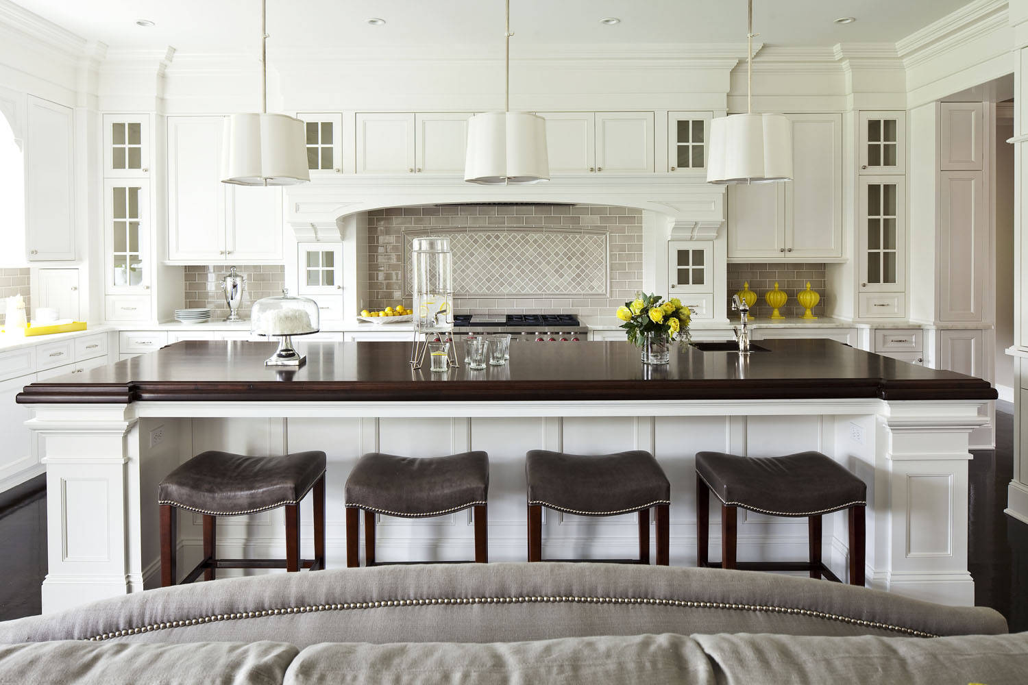 Contrasting color is a great way to add interest to a design. For white kitchen schemes, designers found success in introducing a two-tone color scheme that features white perimeter cabinets, or upper cabinets, with a contrasting island or lower-cabinet color.