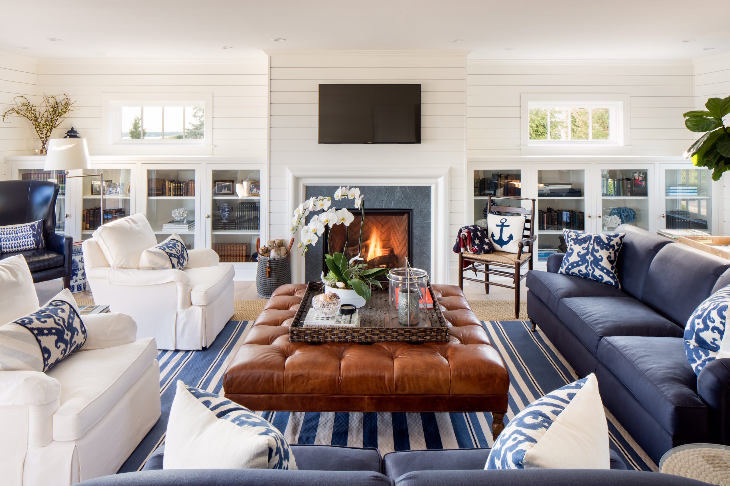Suk Design Group created a fitting seaside style for this award-winning living room in Southampton, New York. White and navy furnishings set the tone, while shiplap walls and nautical-themed decor elevate the design. A brown leather ottoman adds a dose of warmth.