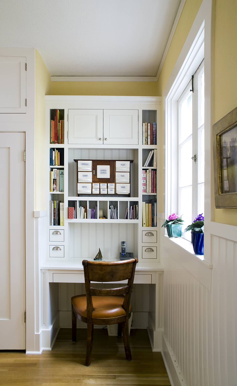 This San Diego kitchen office niche by Hamilton-Gray Design, which won a 2013 Best of Houzz design award, has stood the test of time. A 42-inch-wide floating desk combines with a family heirloom message center above. Beadboard walls and warm yellow wall paint give it a cheery feel. For a similar yellow paint color, try Creamed Butter by Dunn-Edwards or Lemon Meringue by Benjamin Moore.