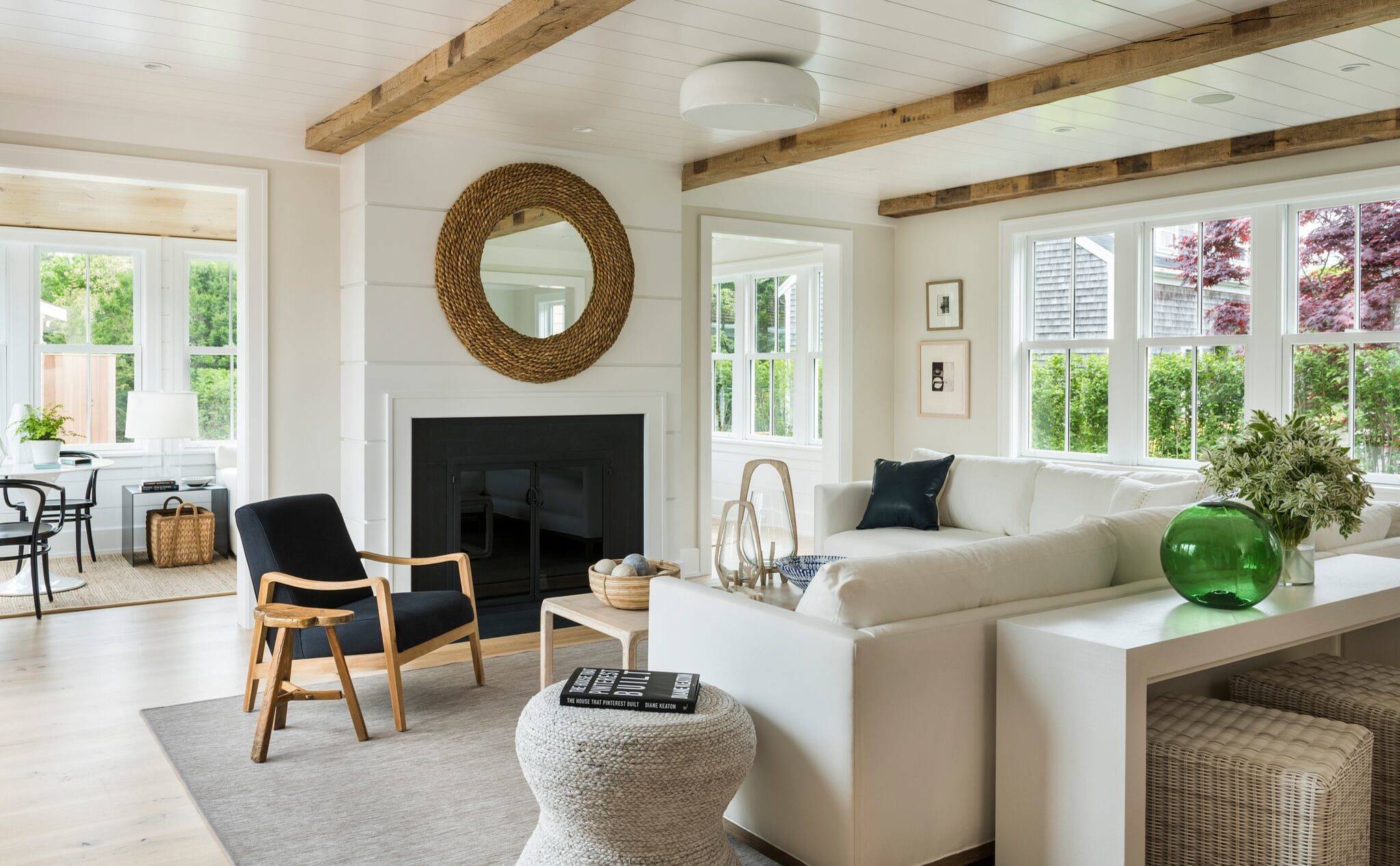 In 2020, we saw a lot of living rooms with wood beam ceilings. Cynthia Hayes Interior Design placed rough-hewn beams in this Providence, Rhode Island, living room. The beams help elongate the room and make the ceiling appear taller than it is. They also warm the mostly white palette.