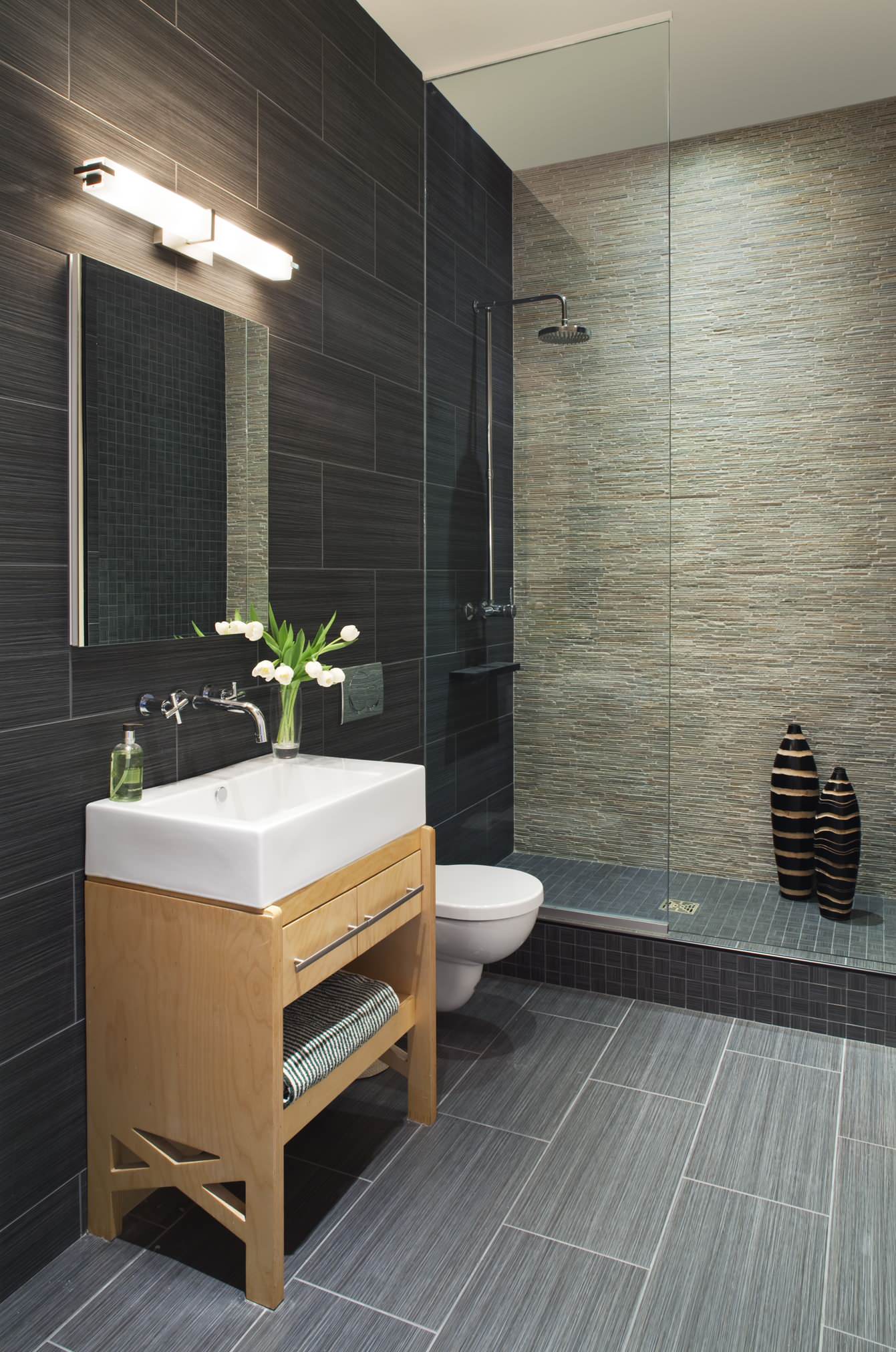 ZeroEnergy Design won a design award for this Boston wet room. Walnut-look porcelain flooring grounds the room in a warm finish. Matte gray large-format porcelain wall tiles in a stacked pattern and a floating vanity deliver a cool contemporary aesthetic.
