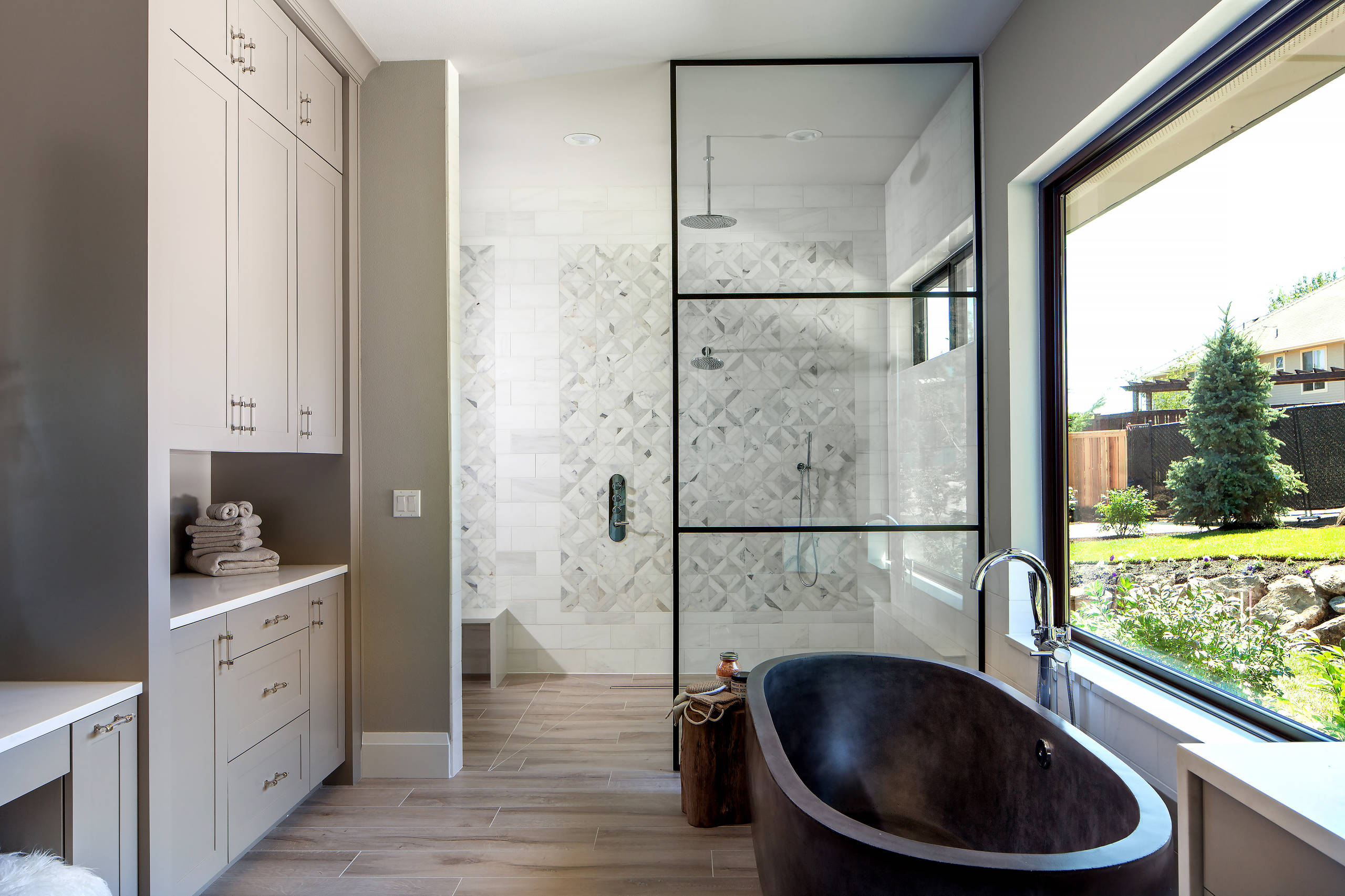 Wendy O’Brien Interior Planning & Design added a curbless shower to this Portland, Oregon, bathroom, earning her a 2021 Best of Houzz design award. Wood-look porcelain tile runs throughout the space. A metal-and-glass panel divides the shower area from the main area, which includes a concrete bathtub. The shower accent wall is marble tile in a quilted pattern. Also notice the greige cabinet paint, a color that’s remained popular over the years.
