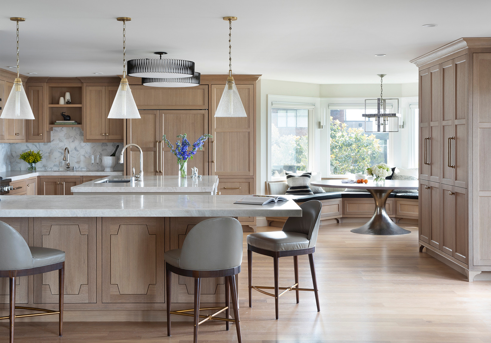 Designer Julie Rootes Interiors used rift-sawn French white oak cabinets in this Tiburon, California, kitchen to create a soft, airy look that nods to nature views. Taj Mahal quartzite countertops and a hexagonal Calacatta marble backsplash heighten the experience. The space won a 2021 Best of Houzz design award.