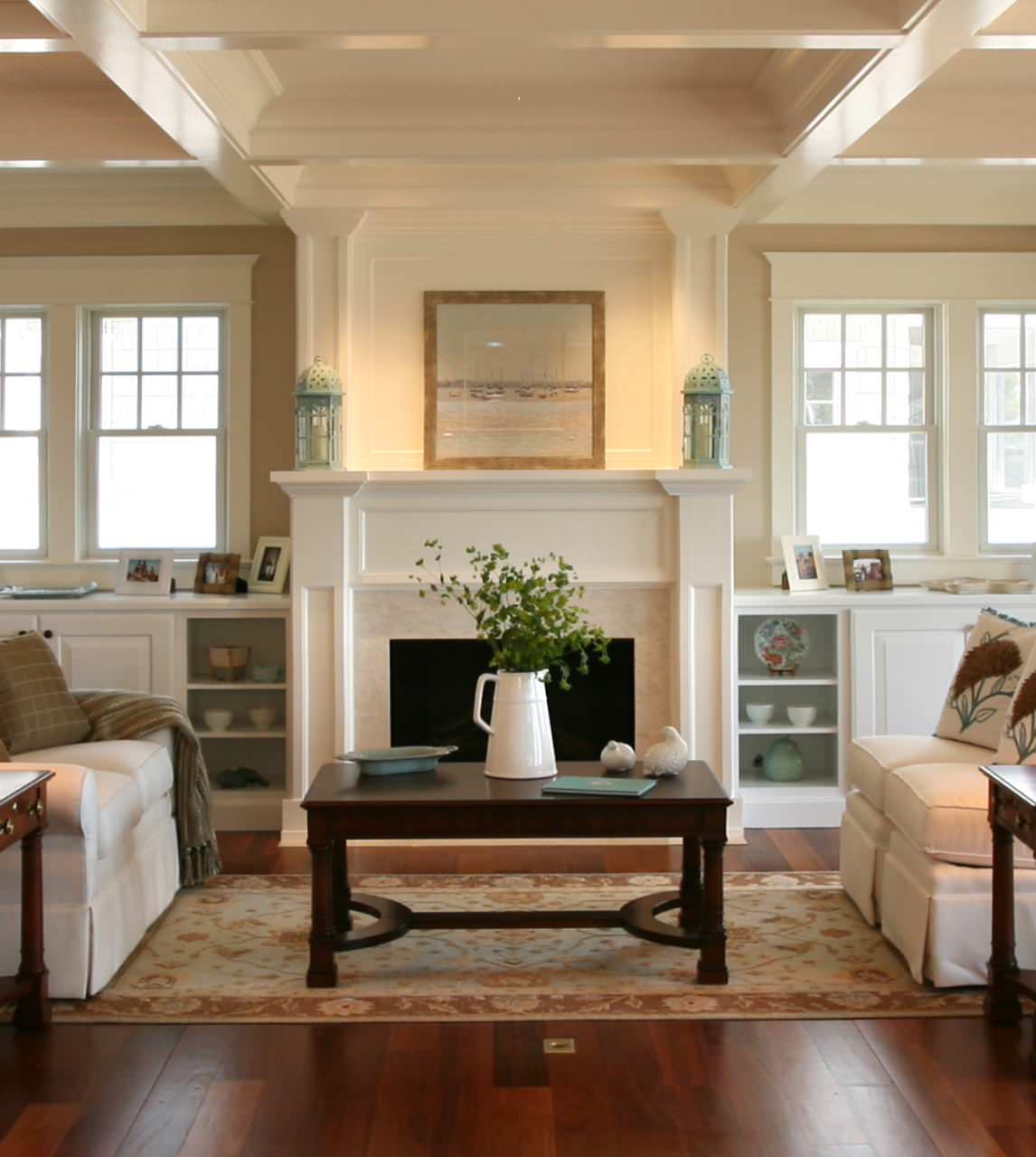 Asher Slaunwhite Architects captured a 2013 Best of Houzz design award for this Philadelphia living room. Creamy white built-ins, fireplace millwork and coffered ceilings lend a comfortable yet sophisticated look to the space. Brazilian teak hardwood floors bring warmth and contrast.