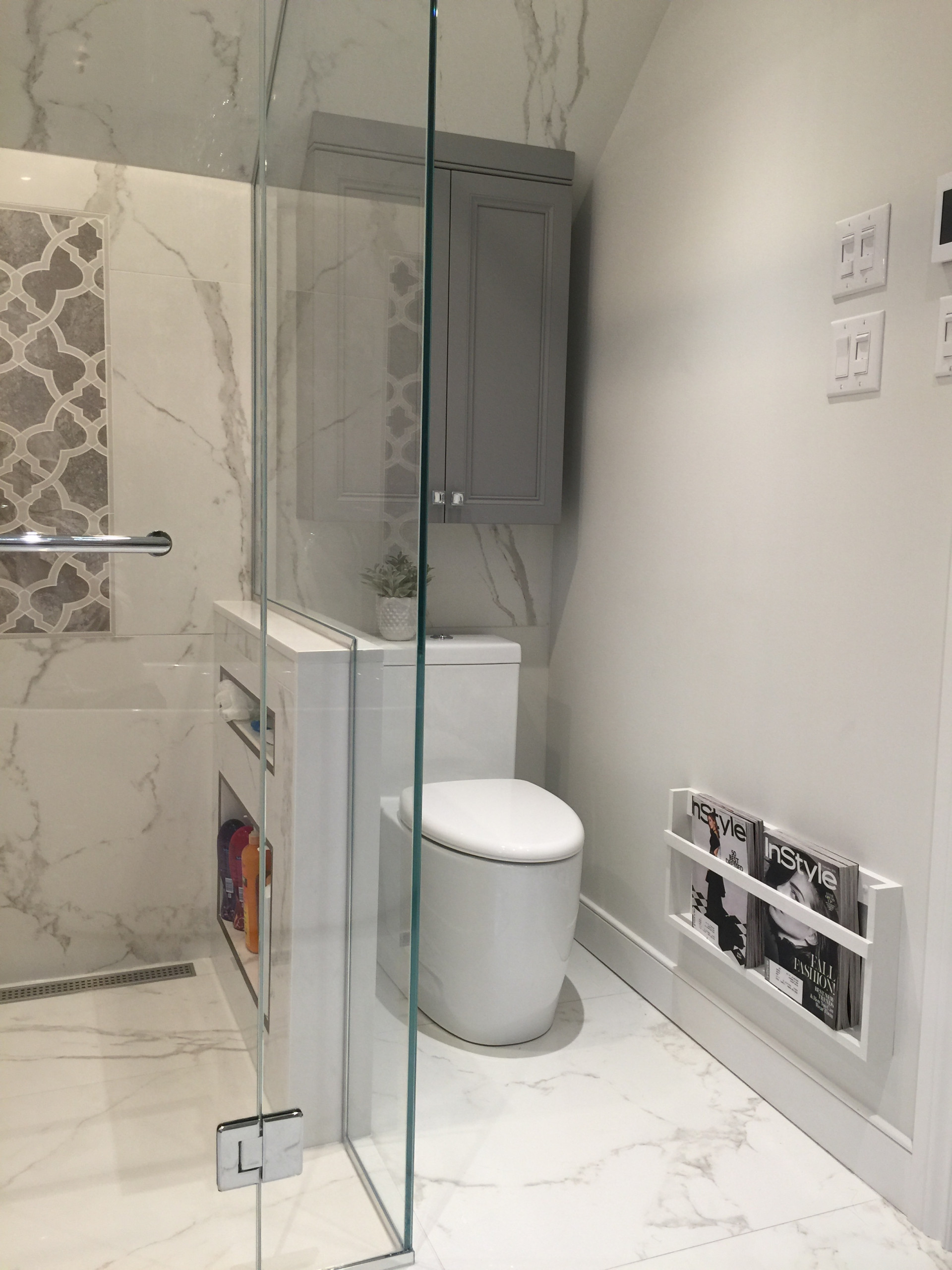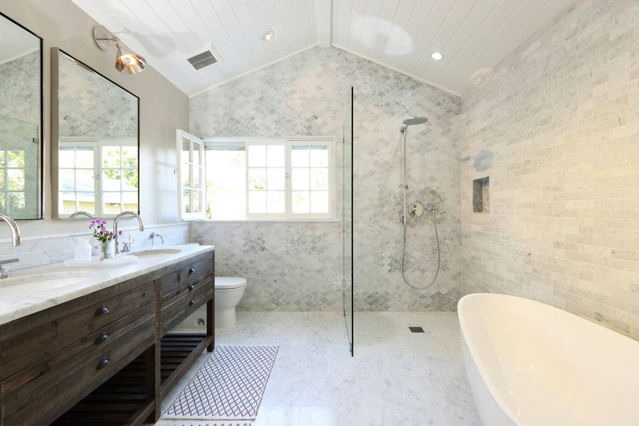 Tile: Carrara marble tiles cover the floors and walls, creating an elegant, spa-like feel. A mix of patterns — arabesque on one wall, brick on another and large format on the floor — gives dynamic character to the space.