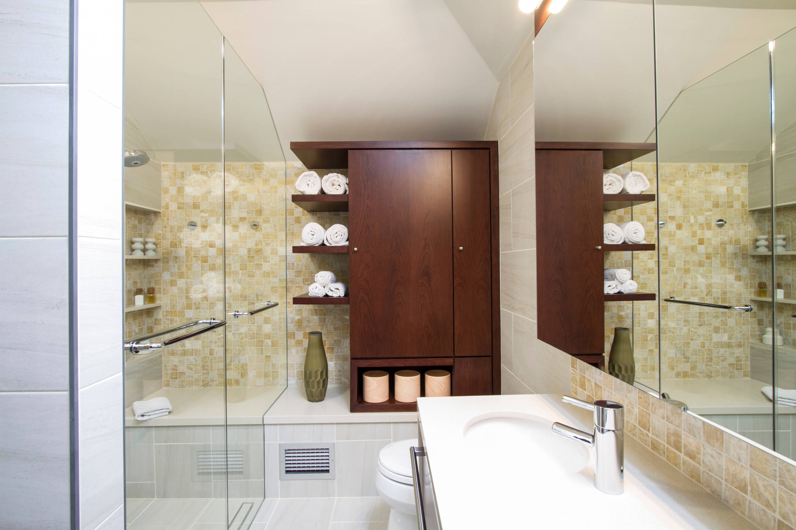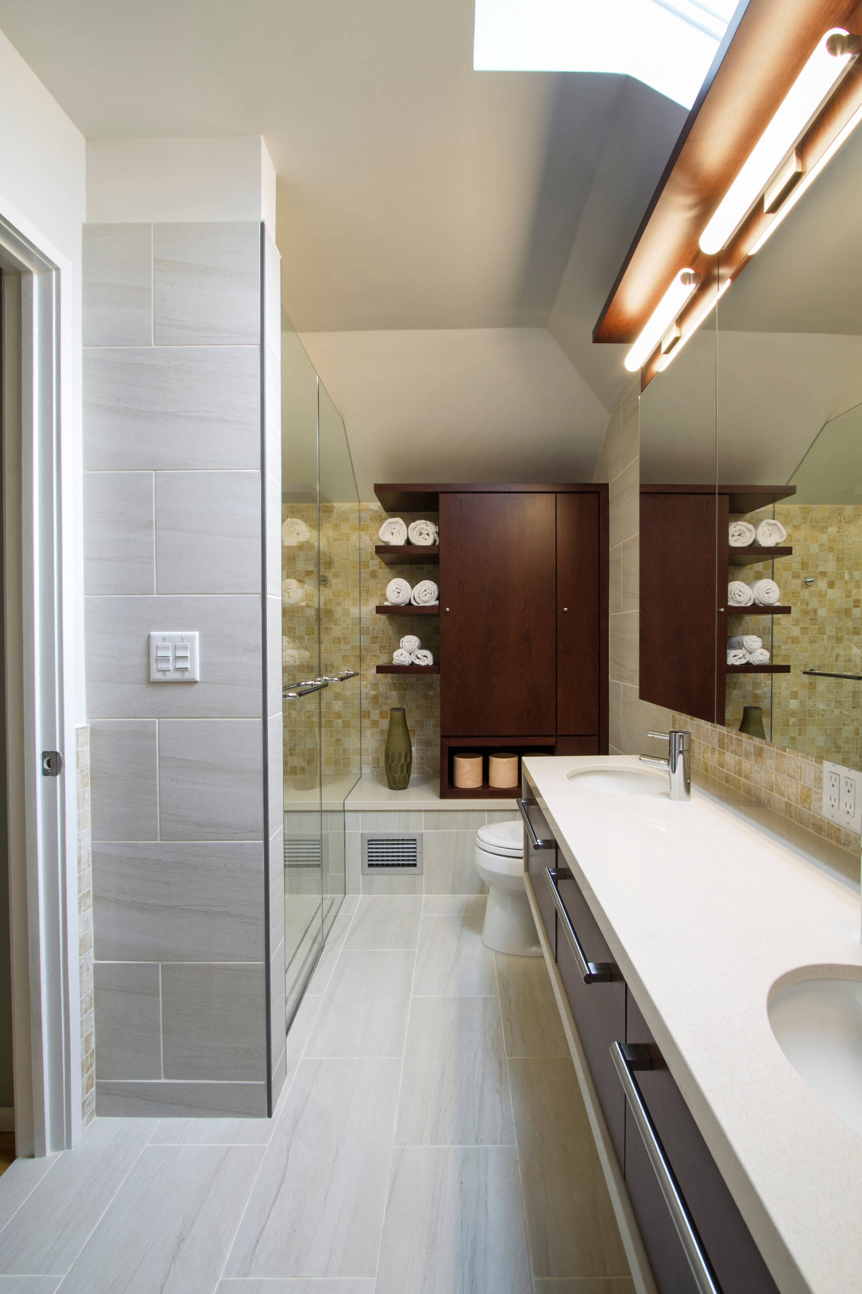 Neat idea: A walnut-fronted recessed medicine cabinet at the end of the vanity creates a beautiful design feature.