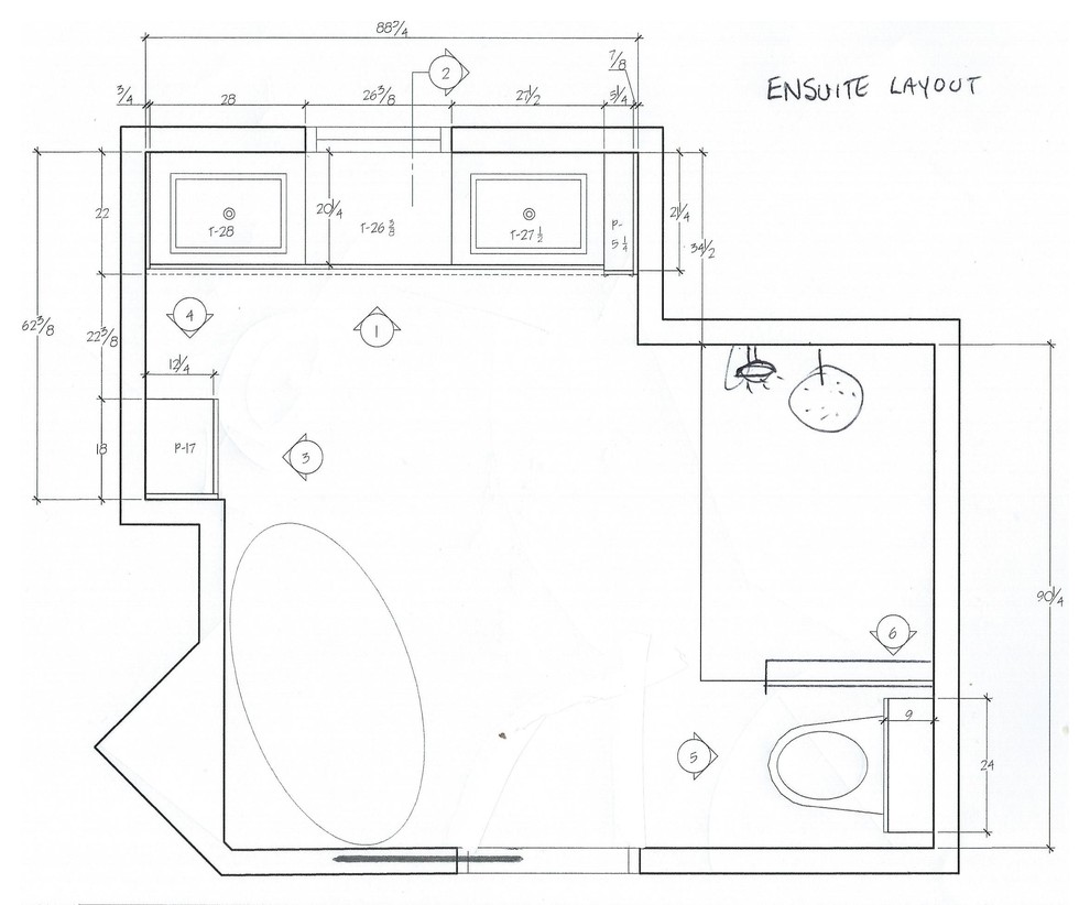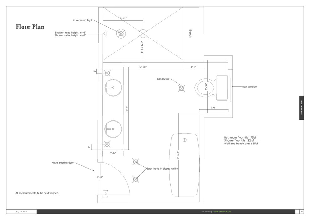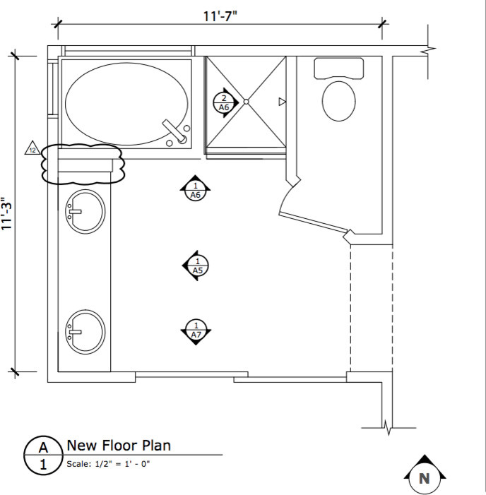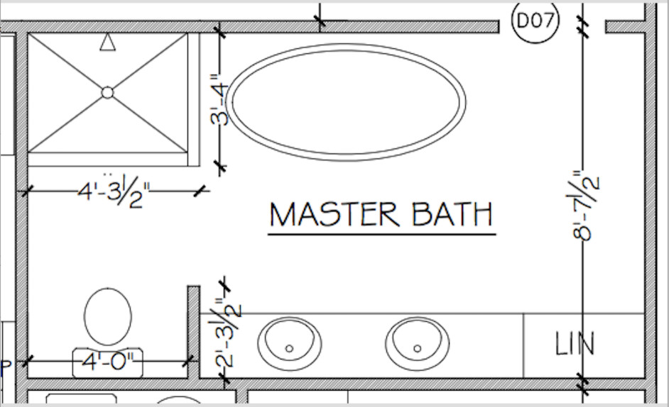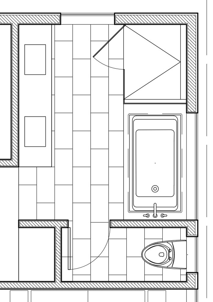Layout: Here you can see the configuration of the various components and how Padvaiskas won the game of inches to get space for everything her client wanted, including a spacious walk-in shower on the right, above the toilet.