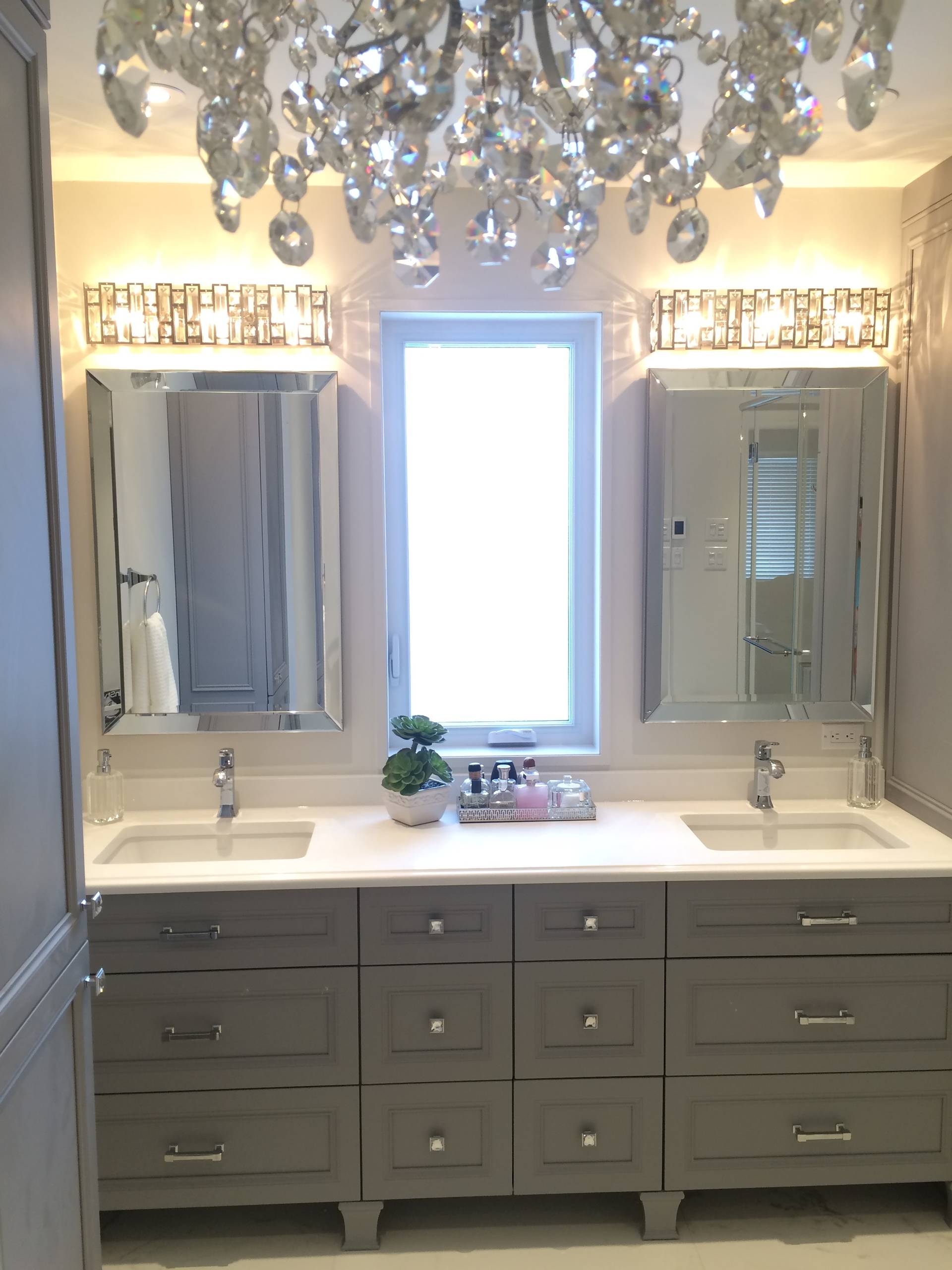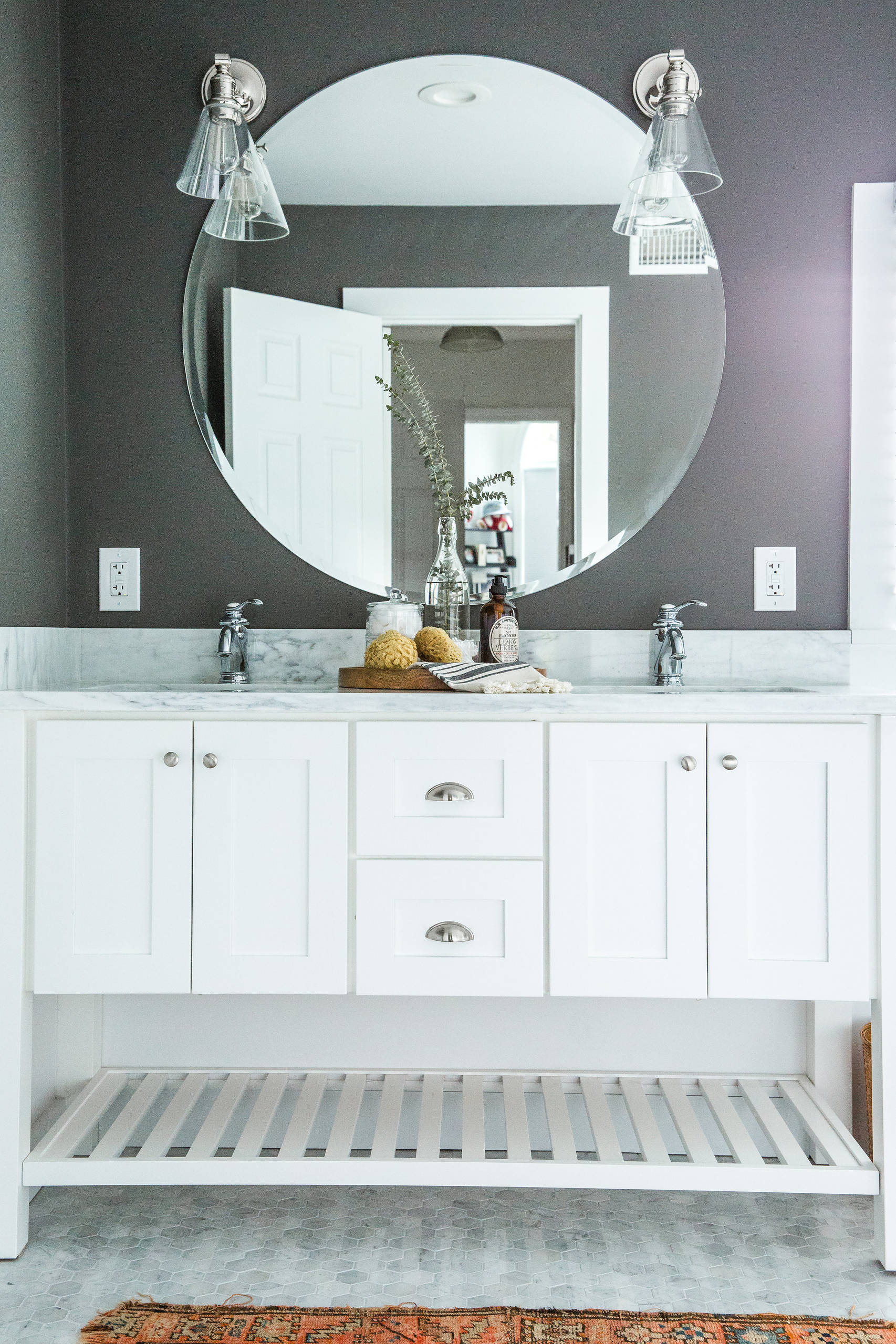 Paint: Pure White, Sherwin-Williams (walls in flat, trim in semigloss); sconces: Kichler; sinks: Decolav