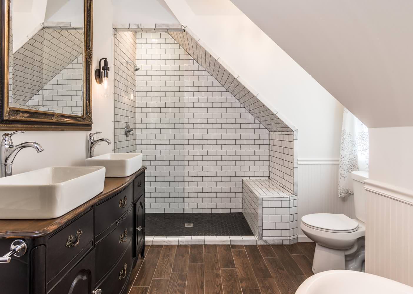 Space savings: The plumbing stayed in the same location to keep costs down, but Conroy did steal from the adjacent attic to push the room out 1½ feet and create a larger shower and bench with a storage armoire above. “It got us more elbow and breathing room and more storage,” he says.