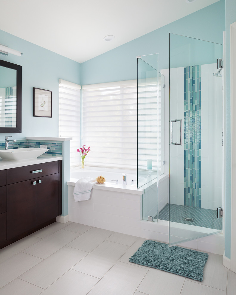 Tile: The clients are near the ocean and love blue-greens, so Jamentz incorporated those shades in the color scheme by way of wall paint and accent tile.