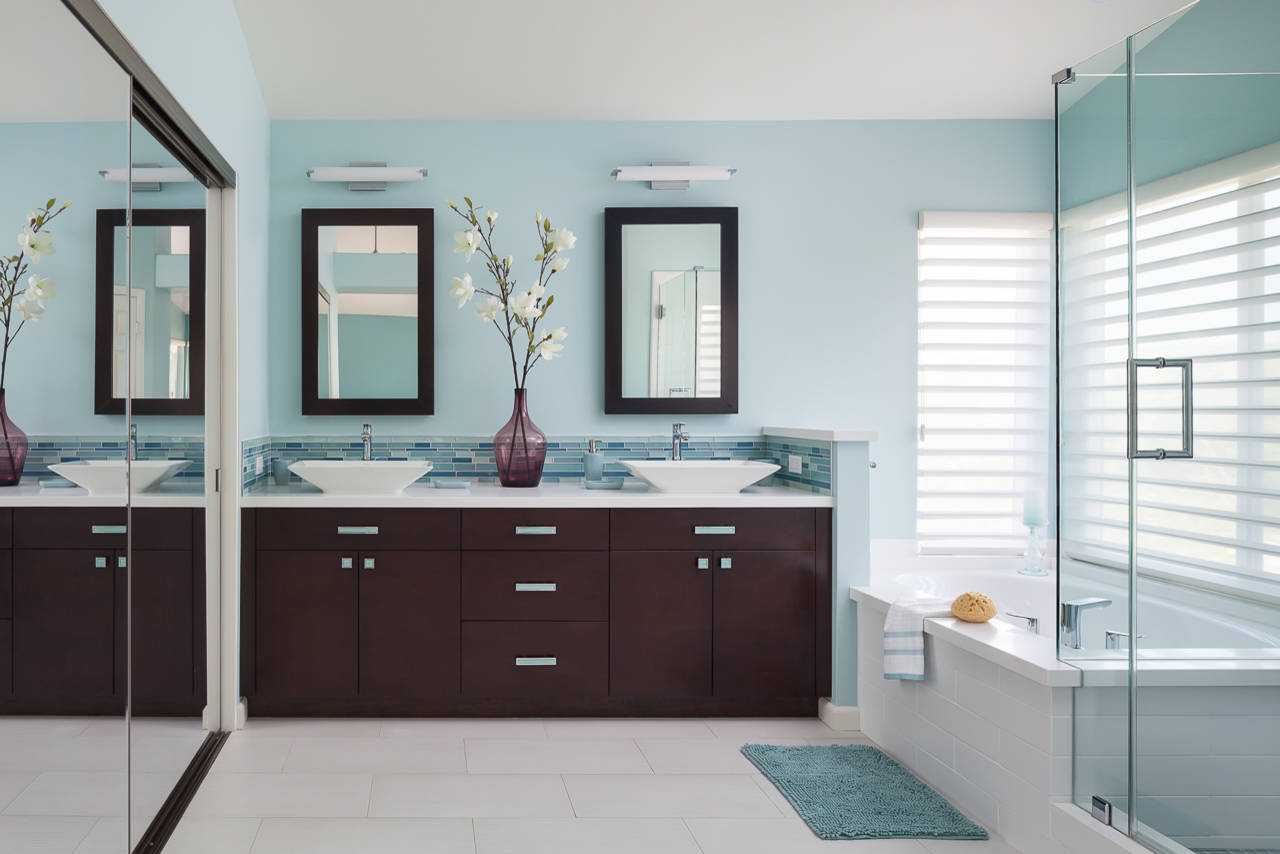 Wall paint: Tide Water at 120 percent, Sherwin-Williams; faucet: Hansgrohe; sinks: Reve, Kohler; faucets: Hansgrohe