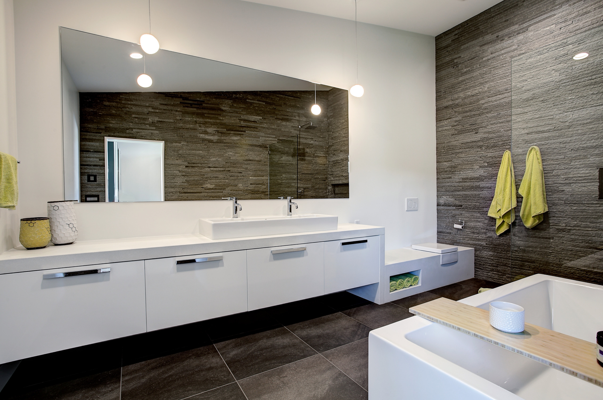 Tile: Textured stone tile covers two walls all the way to the ceiling. The floor is 24-by-24-inch black stone tiles.