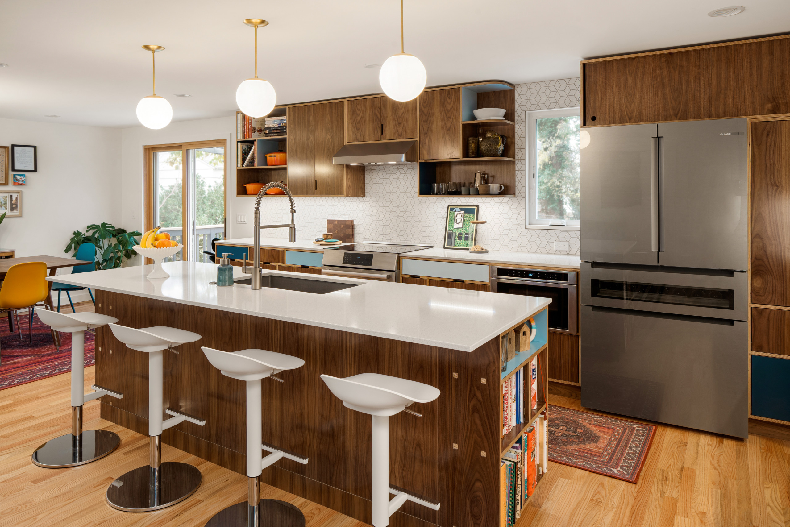 Crescent Builds implemented a layered lighting scheme in this Seattle kitchen, which features recessed ceiling lights, undercabinet lighting and three pendants over the island.
