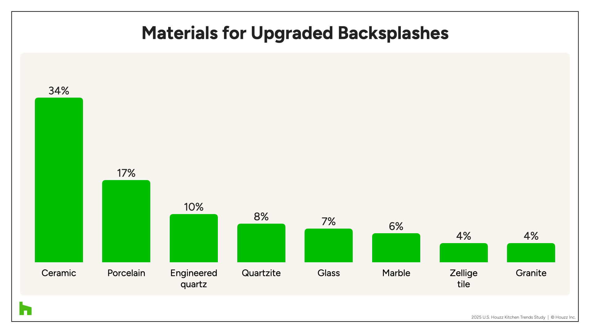 More than three-quarters of homeowners (76%) select tile for an upgraded kitchen backsplash, compared with about a quarter (24%) who choose a slab material. Ceramic remains the top material choice for upgraded backsplashes at 34%, followed by porcelain (17%), engineered quartz (10%) and quartzite (8%).