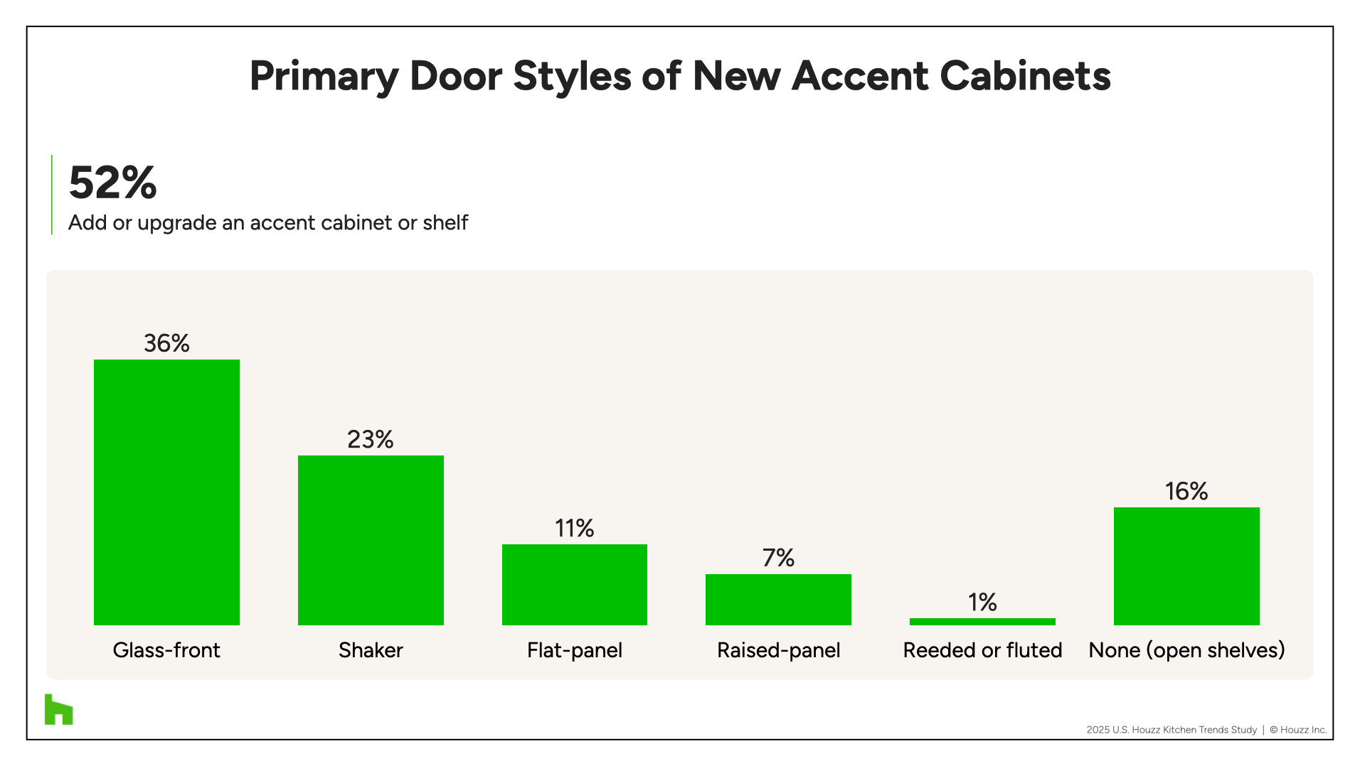 Accent cabinets that differ from the look of the main cabinets can help break up a monotonous expanse of cabinetry to add interest and texture. More than half of renovating homeowners (52%) add or upgrade an accent cabinet or shelf while renovating their kitchen. Glass-front cabinets rank highest, selected by 36%, followed by Shaker-style cabinets at 23% and open shelves without doors at 16%.
