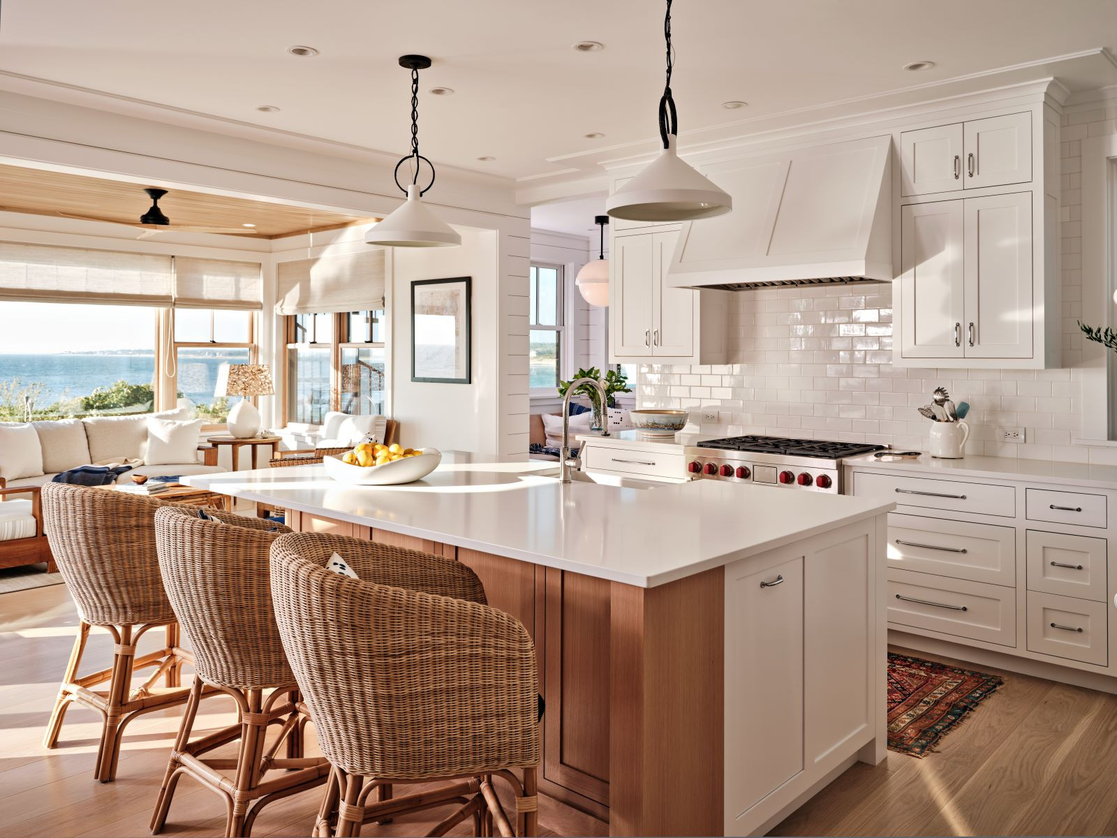 This coastal-style Boston kitchen by McPhee Associates of Cape Cod has many features popular among homeowners, according to the study. They include white Shaker-style cabinets, a white rectangular tile backsplash in a horizontal brick pattern, white countertops, stainless steel appliances and pendant lights over the island.