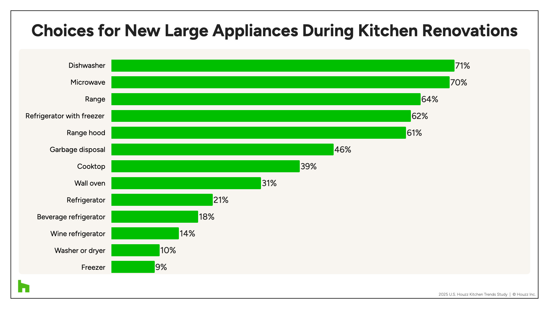Among large kitchen appliances, renovating homeowners go for dishwashers (71%) and microwaves (70%) most frequently, followed by ranges (64%), refrigerator-freezer combinations (62%) and range hoods (61%). Homeowners also frequently upgrade cooktops (39%) and wall ovens (31%), while smaller shares opt for beverage refrigerators (18%) and wine refrigerators (14%).
