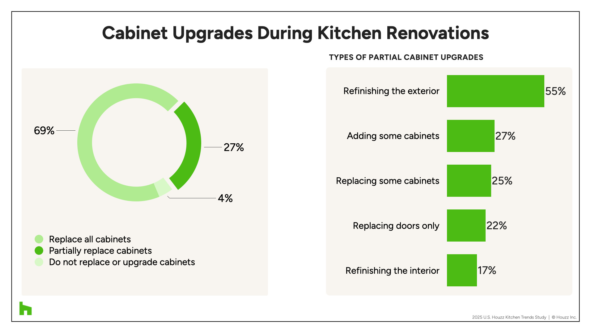 Kitchen cabinets are a top priority for homeowners remodeling their kitchen. Nearly 7 in 10 renovating homeowners (69%) replace all of their cabinets as part of a kitchen upgrade. Only a small portion of homeowners (4%) leave them untouched.