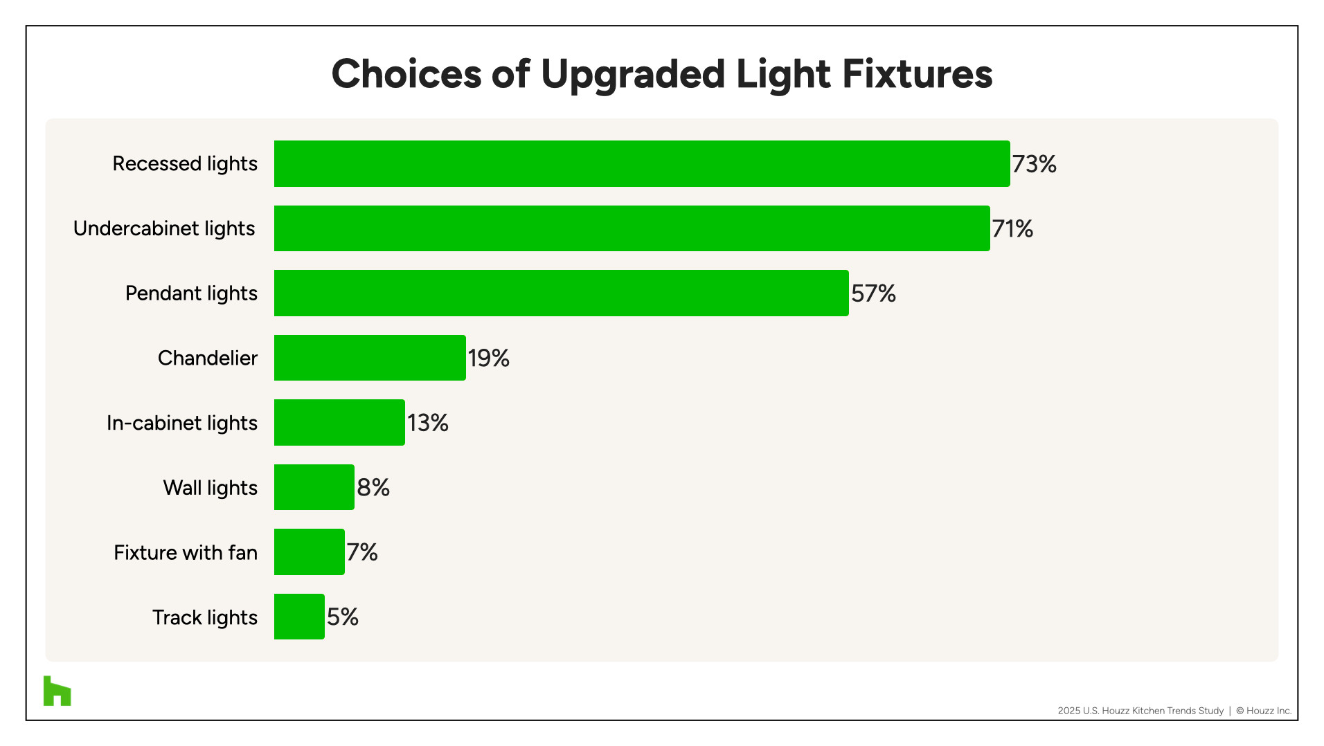 Pendant lights are the predominant island lighting choice (65%). Recessed lights are the second-most-popular option (30%), while only a few homeowners opt for chandeliers (9%) or flush-mount lights (6%).
