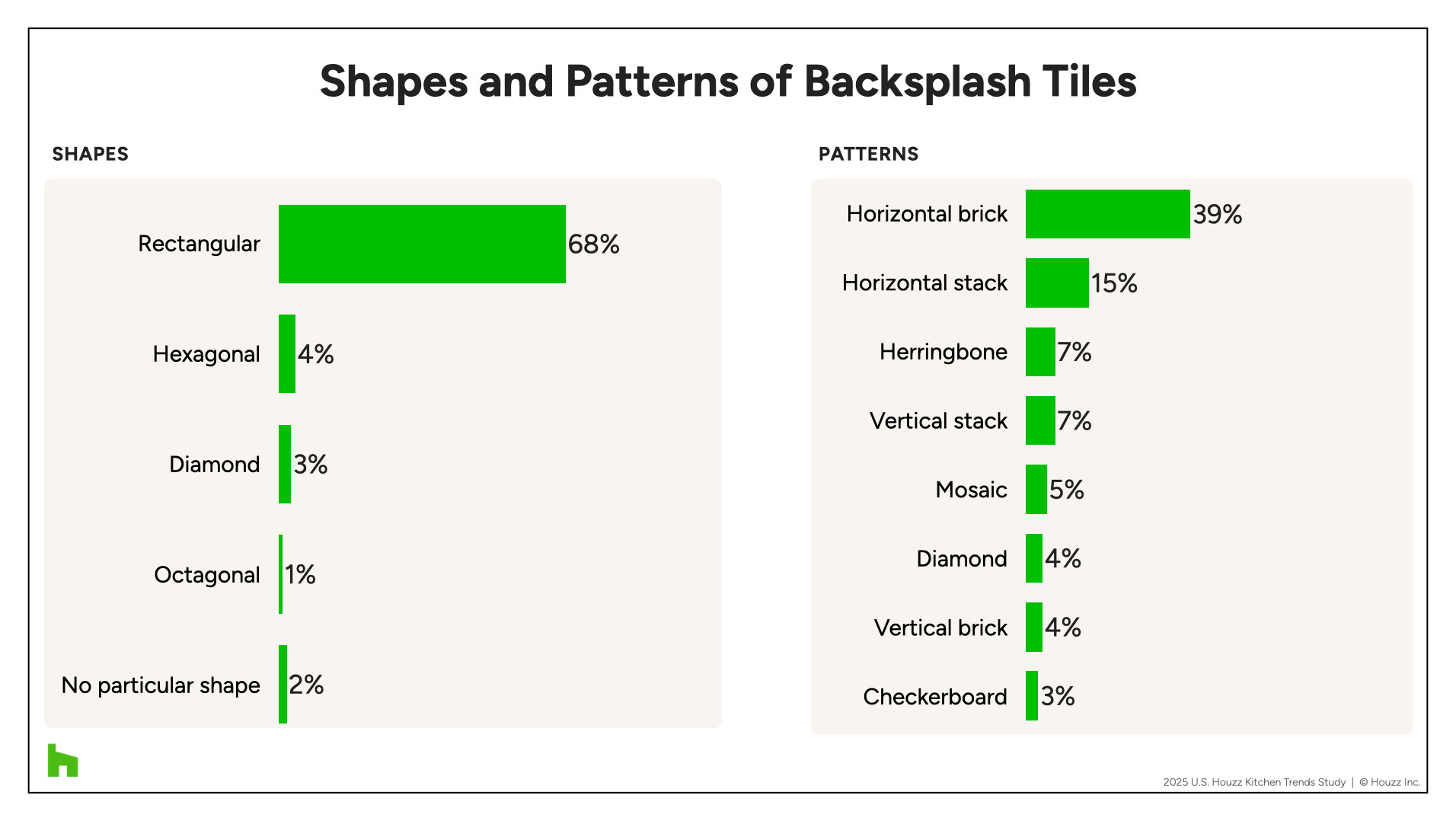 When it comes to patterns, horizontal brick is the most favored, with nearly 2 in 5 renovating homeowners choosing it. Horizontal stack follows at 15%. Herringbone and vertical stack patterns are tied for third at 7%.