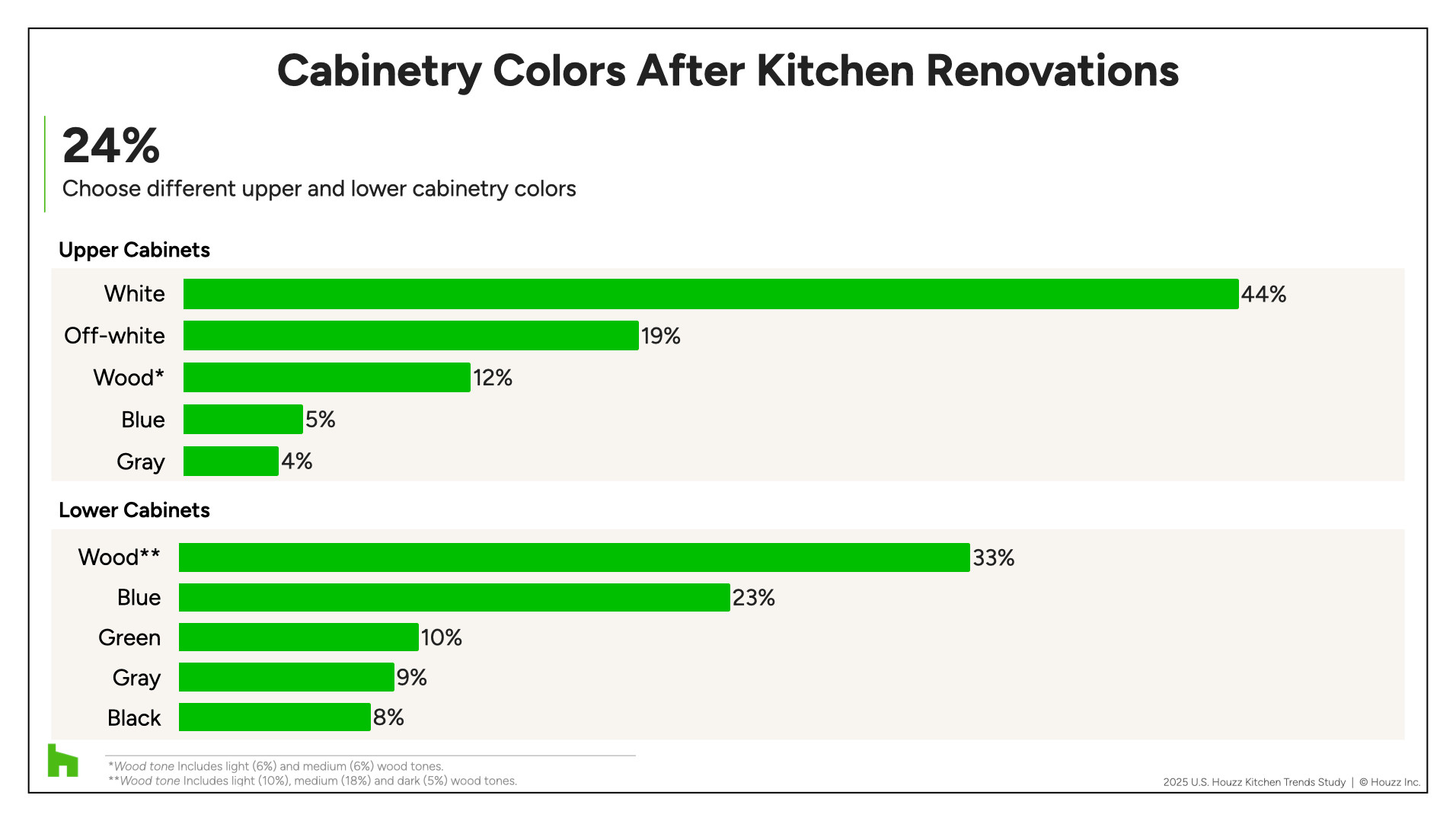 Nearly a quarter of renovating homeowners (24%) choose contrasting colors for their upper and lower kitchen cabinets. As with cabinets in general, white is the top choice for upper cabinets, with 2 in 5 homeowners choosing it. Off-white follows at 19%. As for lower cabinets, wood tones lead the way at 33%, with medium-tone wood accounting for 18% of that figure. Blue also is a popular choice, selected by more than 1 in 5 homeowners.