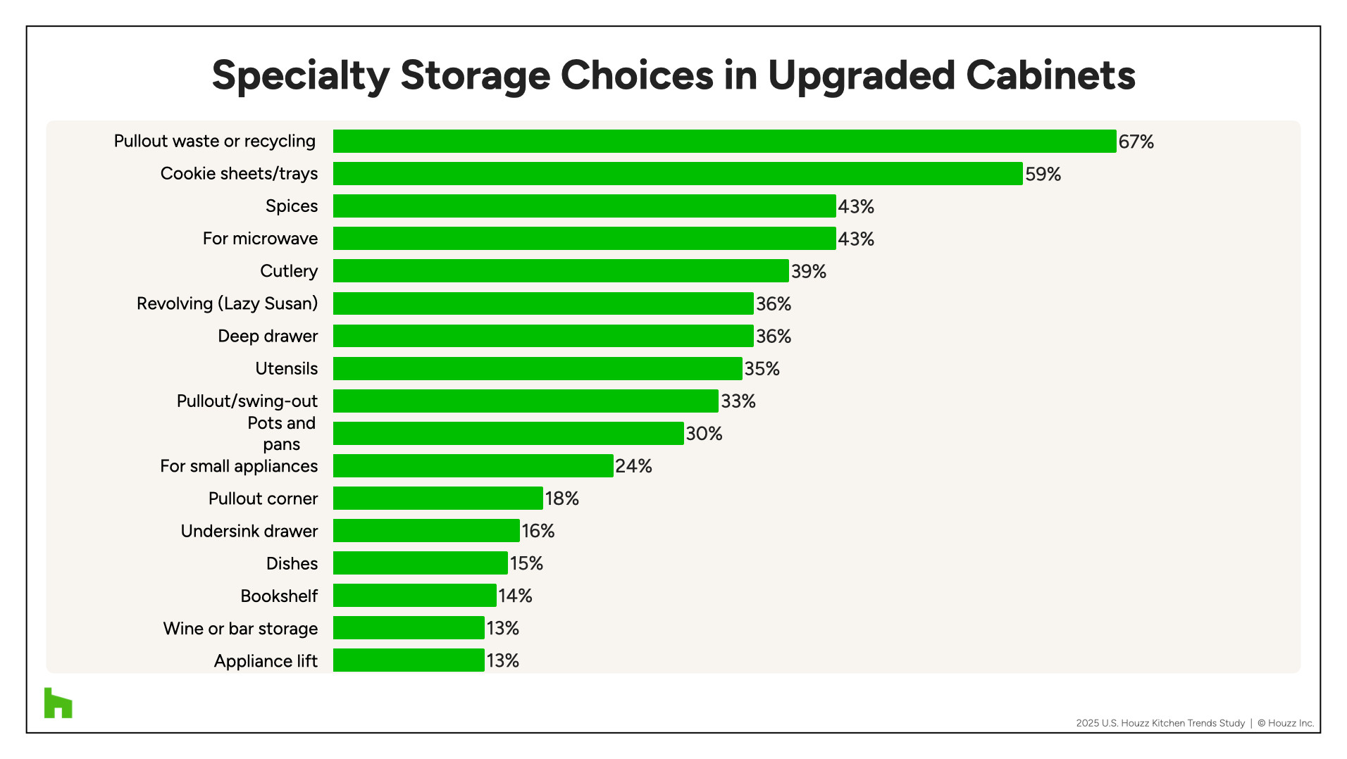 In many cases, what’s inside the cabinets is just as important as what’s on the outside, and homeowners continue to add specialty storage solutions to their upgraded cabinets. Pullout waste or recycling bins top the list, selected by 67% of homeowners. Cookie sheet and tray organizers follow closely at 59%, while storage for spices and microwaves are also popular, chosen by 43% each. Other widely embraced features include cutlery trays (39%), lazy Susans (36%), deep drawers (36%) and utensil organizers (35%). Smaller shares of renovating homeowners opt for bookshelves (14%) and appliance lifts (13%).
