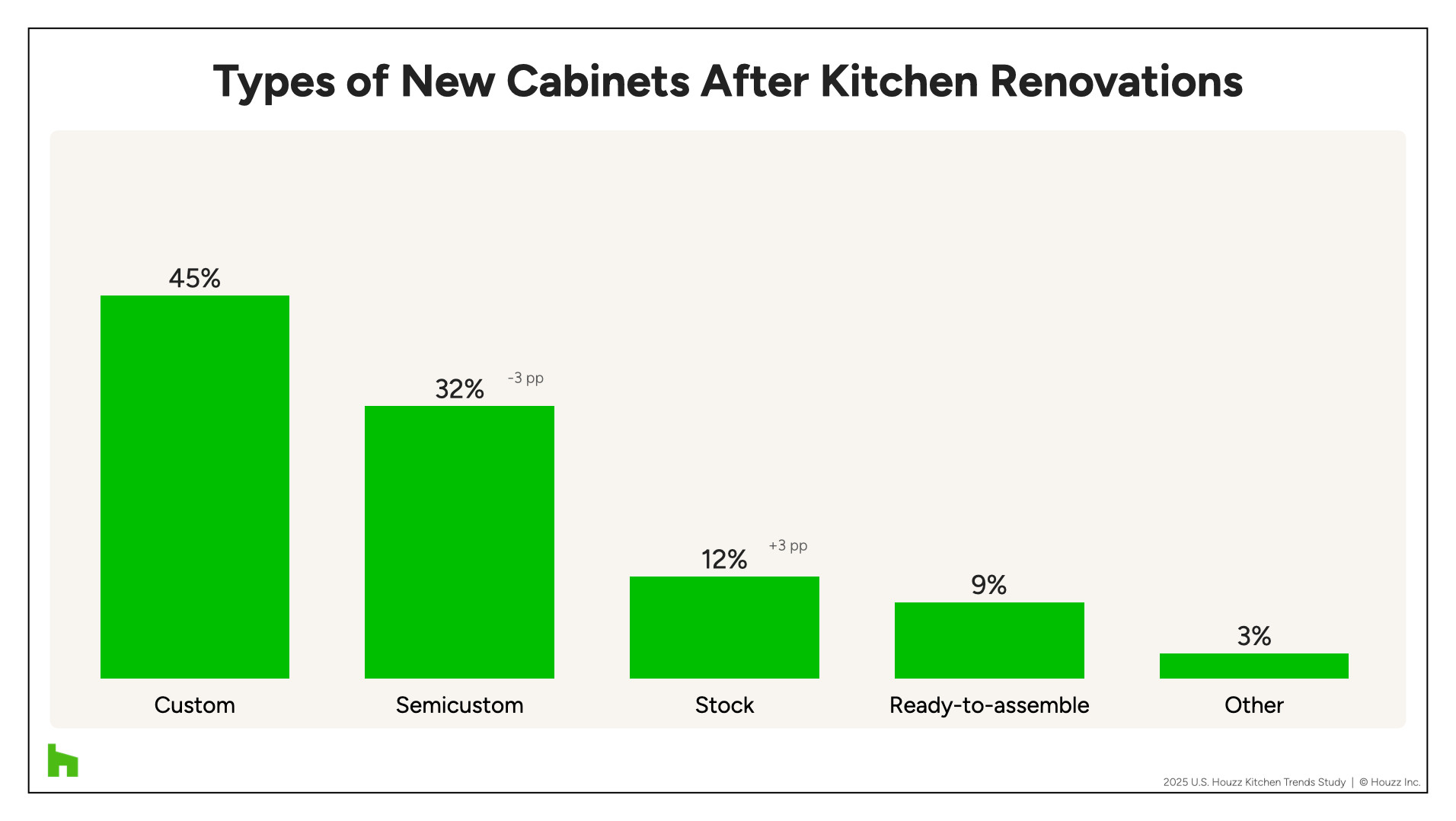Fully customized (45%) and partially customized (32%) cabinets are the most popular types of new cabinets. And it’s worth noting that 32% of homeowners hire cabinetmakers during a kitchen remodel, the most-hired professional after general contractors (50%). Meanwhile, stock cabinets are on the rise, increasing in favor by 3 points year over year, to 12%.