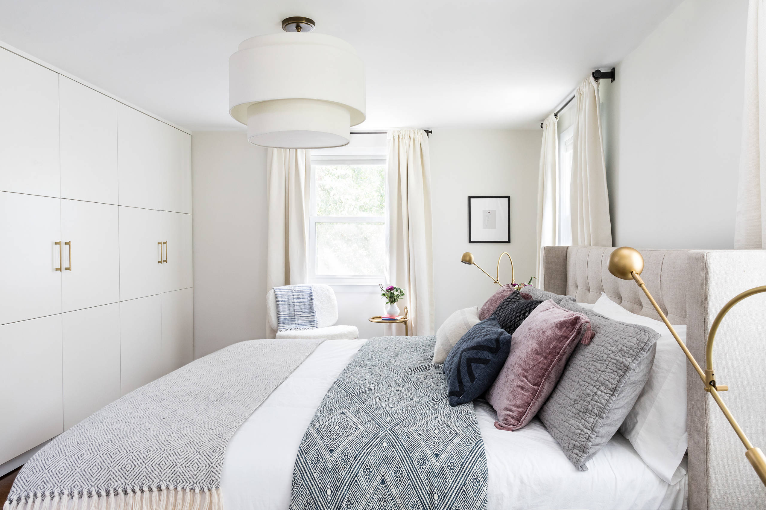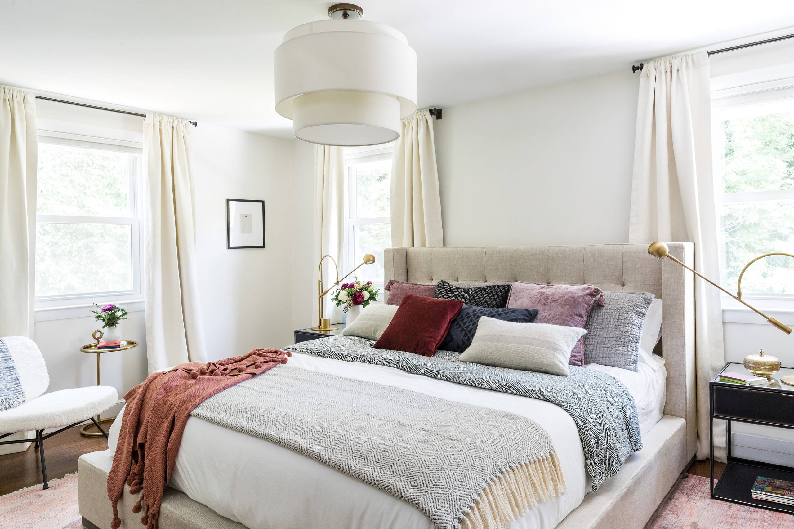 This Boston master bedroom is located on the second floor and includes three windows overlooking a bucolic backyard, which is why the homeowner asked designer Dana Arazi Levine to create an interior with muted, serene hues that wouldn’t distract from the lush views. The result is a fresh space awash in creamy tones with touches of matte black and brass, which continue into the remodeled master bath.