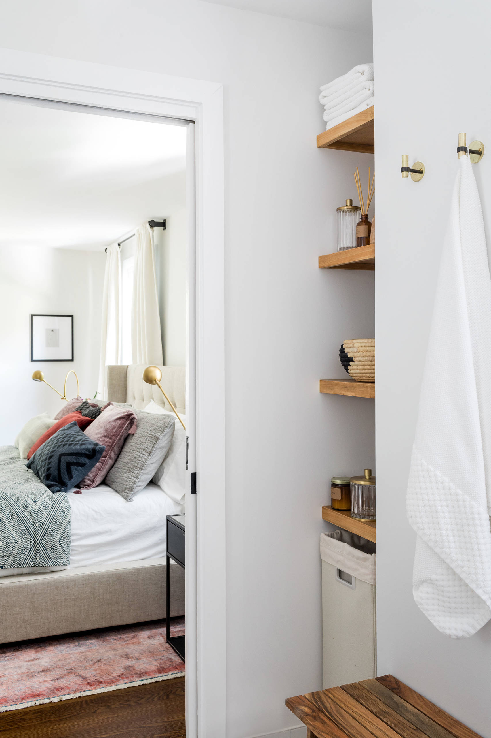 At the entrance to the bathroom, a small open closet area with four white oak shelves and a hamper underneath provides storage for linens and other bath accessories. The wall to the right of the shelves conceals a chimney from the first-floor fireplace. Arazi Levine added a pair of brass hooks on the wall for towels.