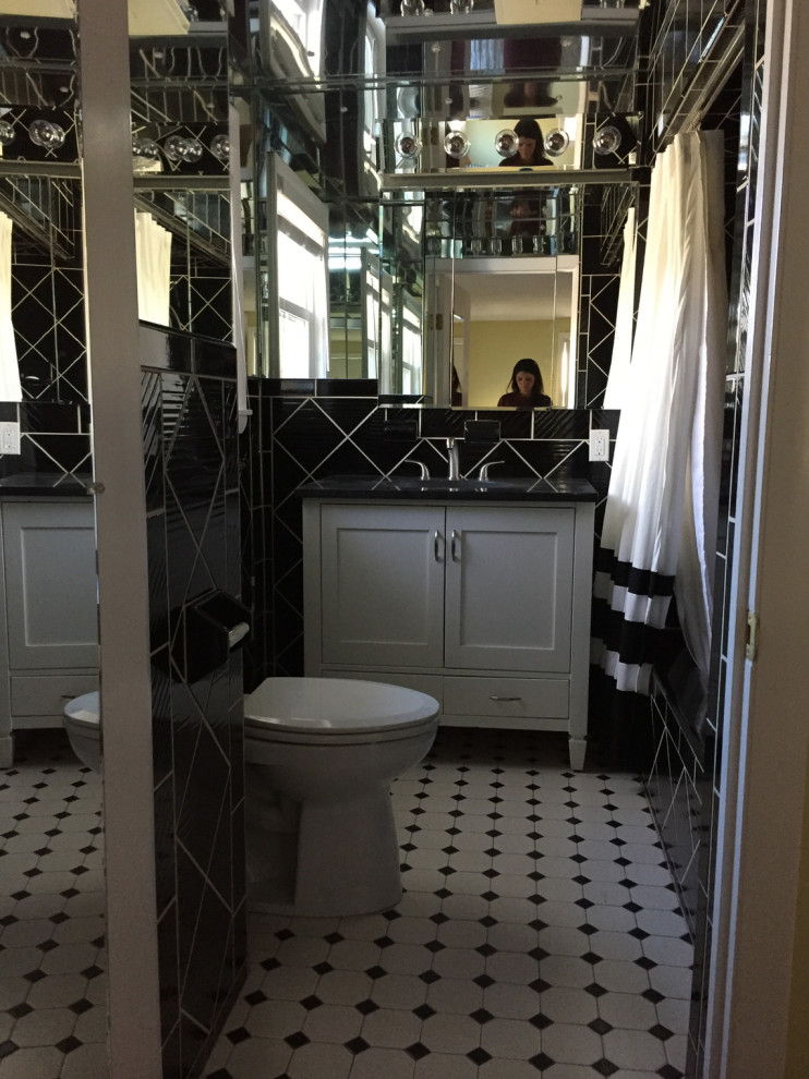 After: Arazi Levine reconfigured the bathroom layout by adding a walk-in shower to the left side of the room and a vanity and toilet along the right side. “The homeowner was fine with having no bathtub, which allowed us to put in a light and bright walk-in shower that really opens up the space,” she says.