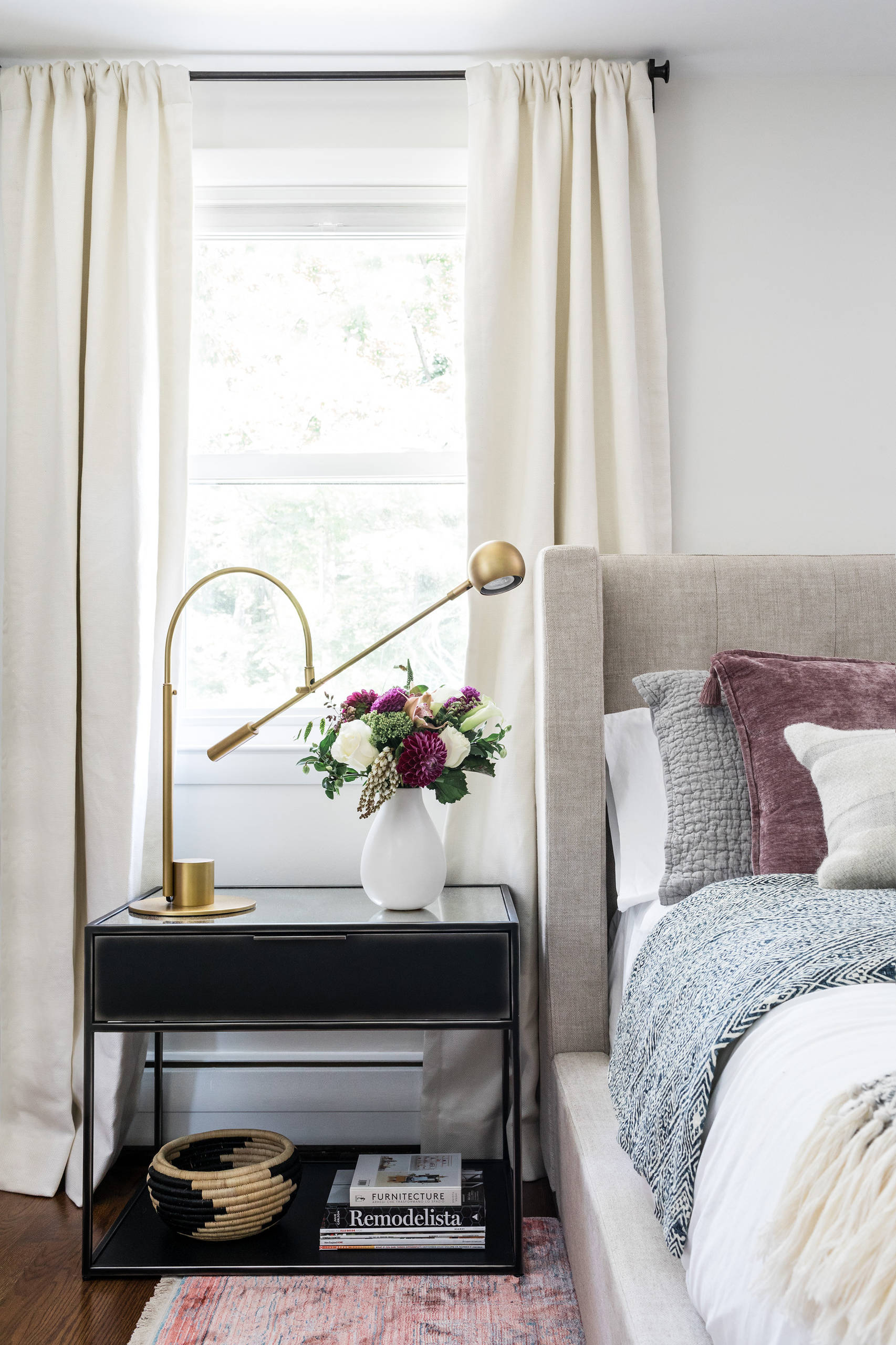 The nightstands are blackened steel with a mirrored top. A pair of brass swing-arm table lamps atop them are adjustable and provide great light for reading in bed. A new distressed area rug and an assortment of throw pillows on the bed provide subtle touches of color.
