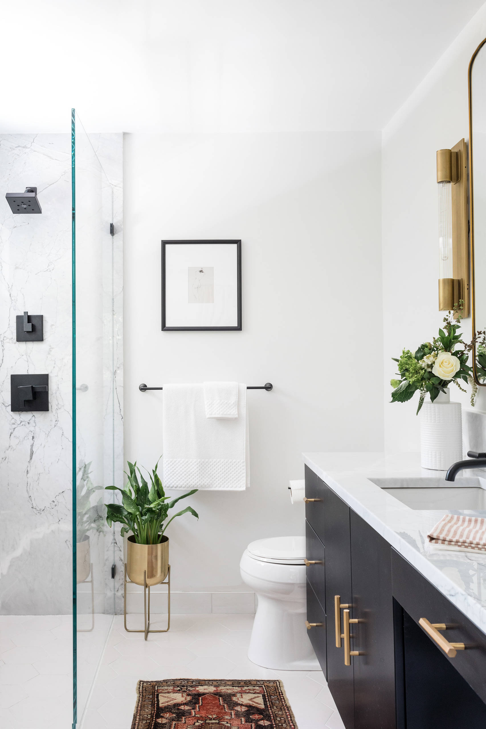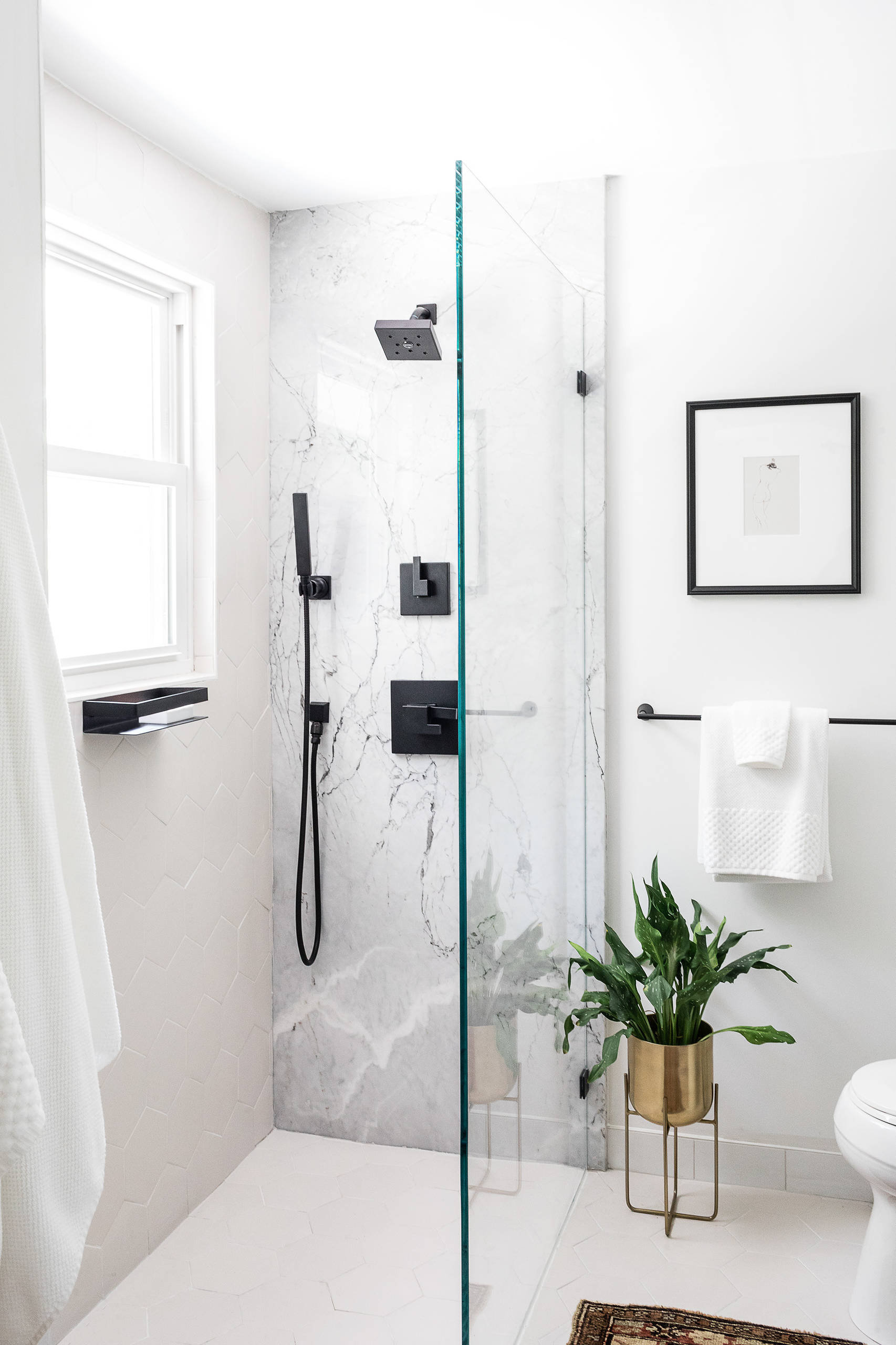 The feature wall is a large slab of marble, with matte black fixtures. A fixed glass shower door allows light from the window to flow into the room, keeping things bright.