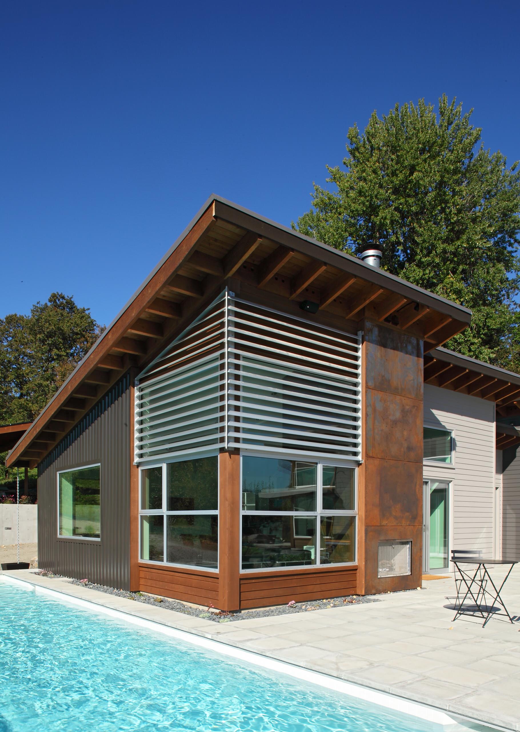 Exposed rafters add visual appeal to the underside of this shed roof.