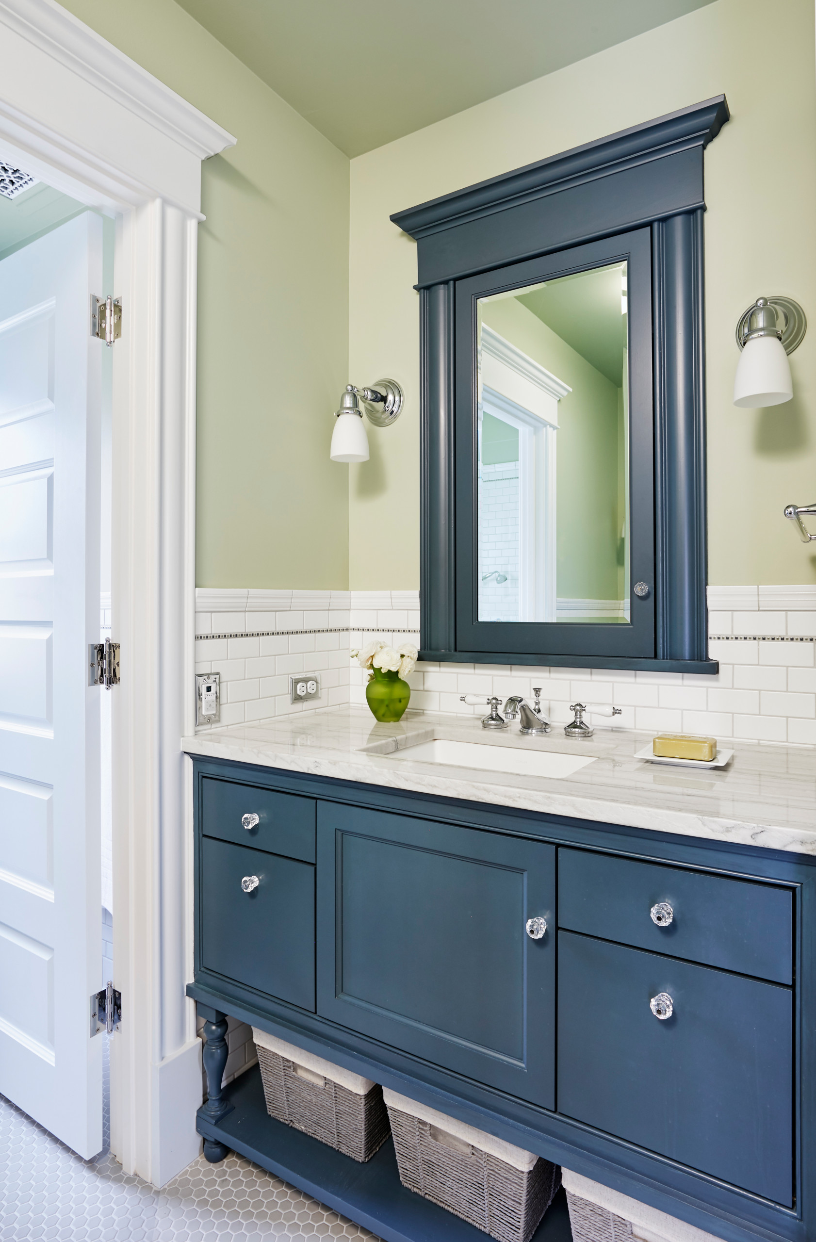 There’s always room for something off the beaten path. Jason Myrlie of J. Carsten Remodeling took an unusual approach by hiding this medicine cabinet behind framed artwork. His customer purchased a medicine cabinet with a mirrored door and supplied him with a picture.