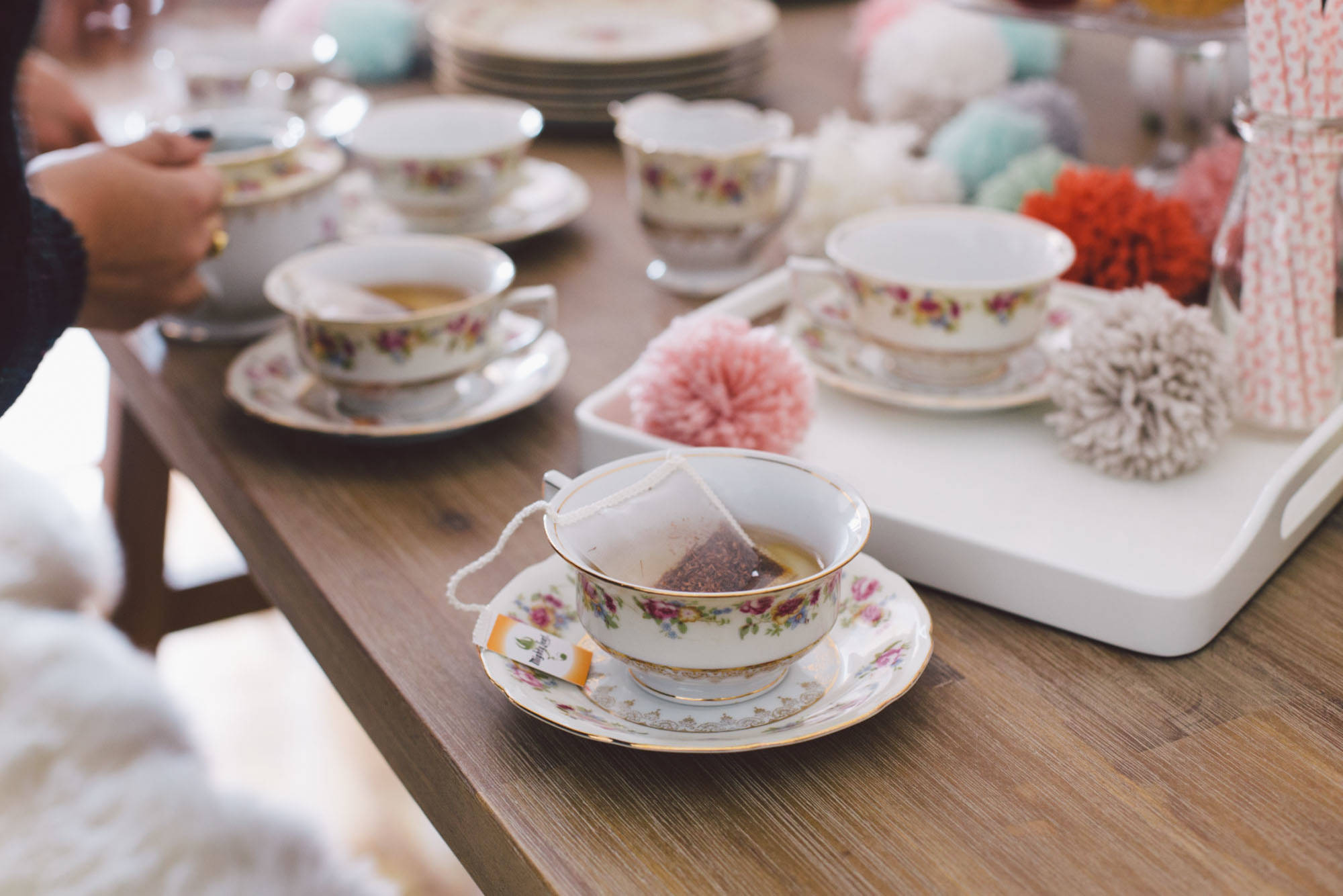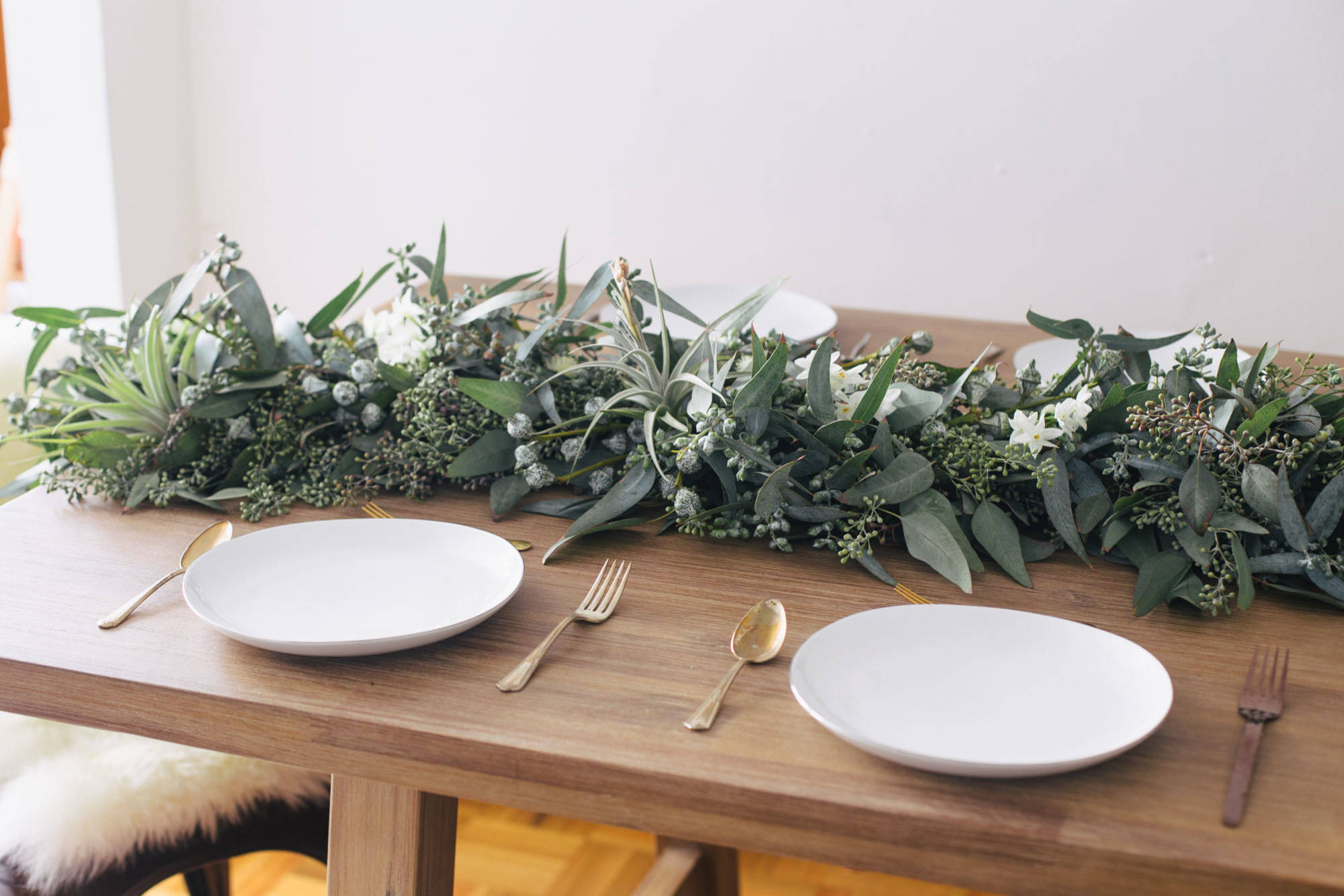 Enlist guests in crafting the decor. Their involvement doesn’t have to be related to food: A collaborative craft that doubles as a decoration and a party activity is a win-win. You could make a garland for the table, asking each guest to bring a bundle of greens to add to the arrangement. The one shown above uses seeded eucalyptus, but any seasonal greenery that’s widely available in your area would work. Or whip up some pompoms using yarn — a great stash-busting activity if you or your friends knit.