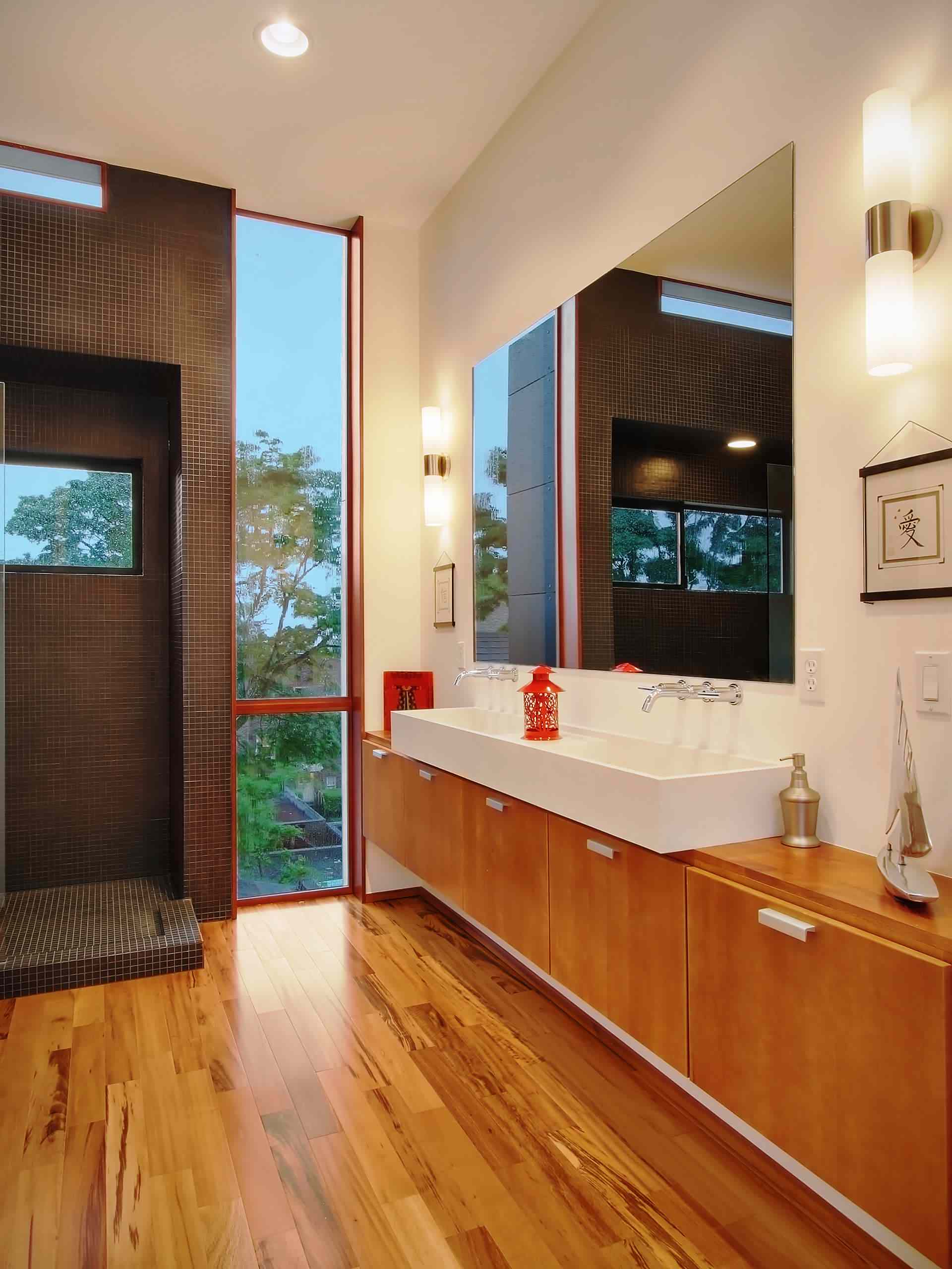 Some elements to keep in mind when designing your double vanity are symmetry, ample counter space between sinks, a large mirror spanning both sinks (or one mirror over each sink) and lighting.