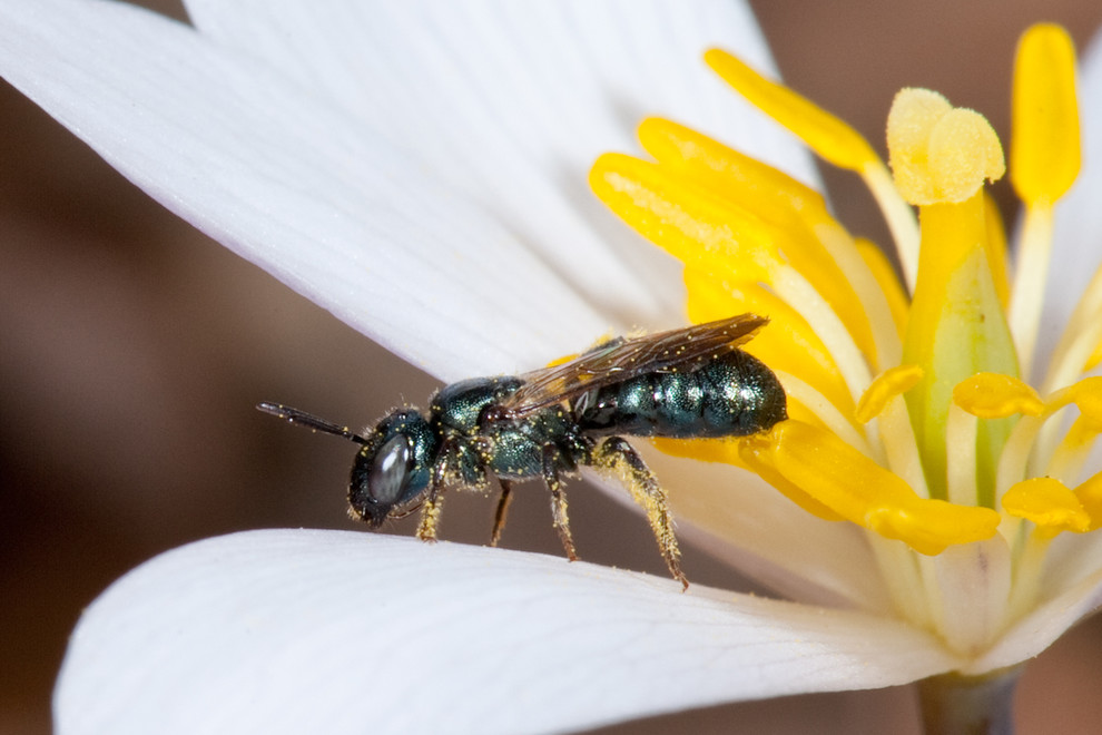 Shown: A female small carpenter bee on bloodroot (Sanguinaria canadensis)