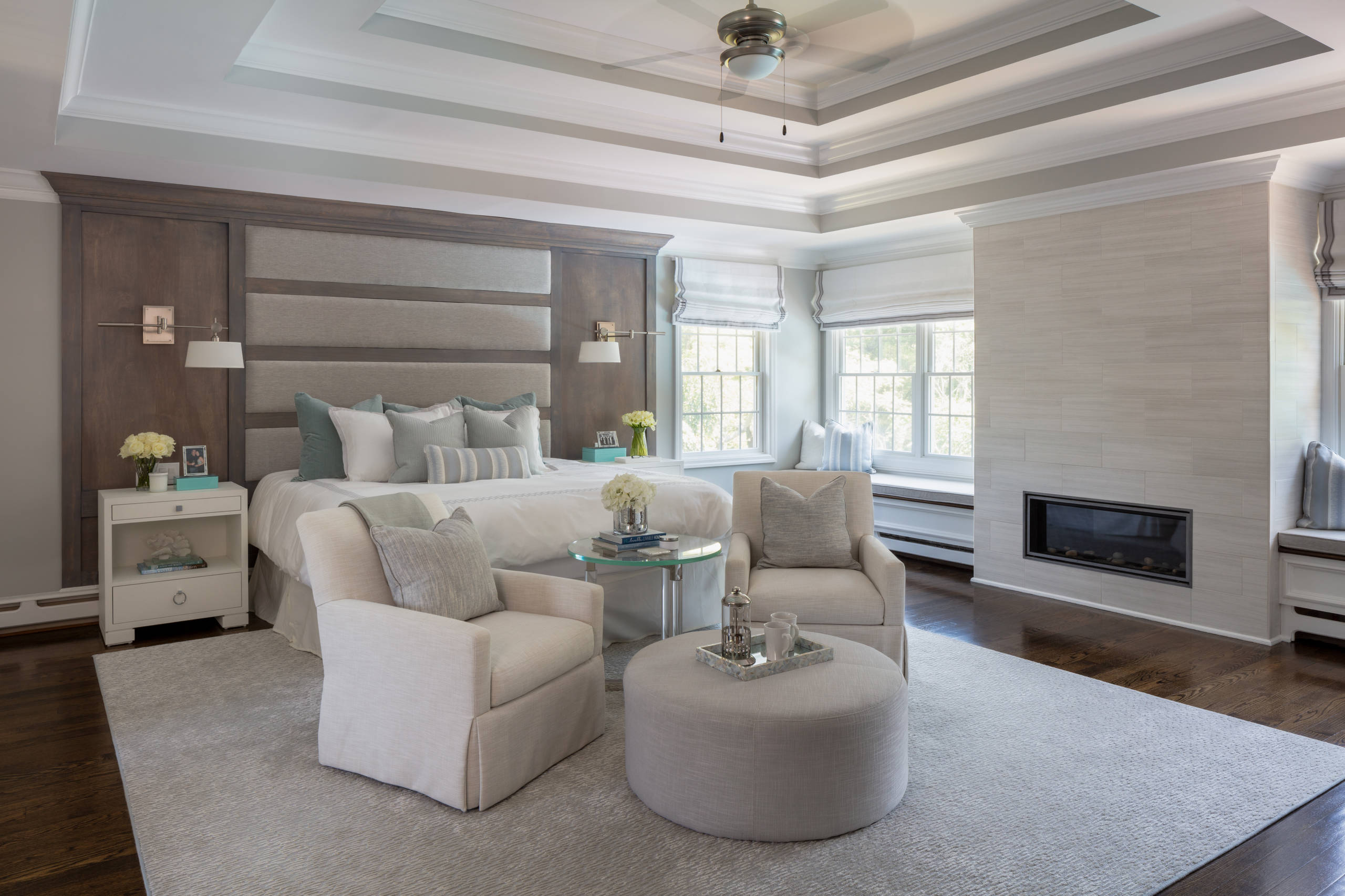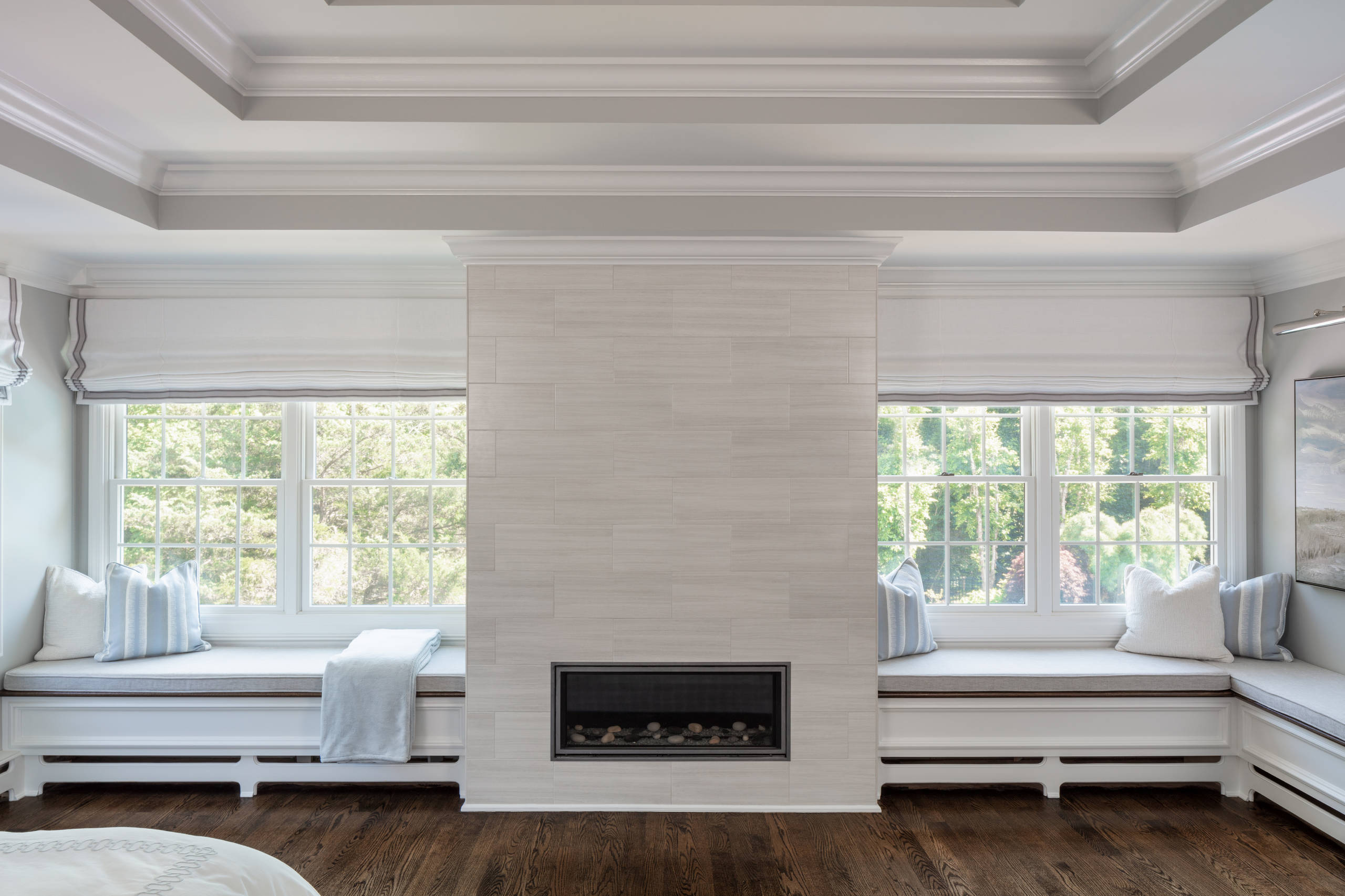 After: Larger double windows with custom window seats give the homeowners the improved views they wanted. Campana added a contemporary direct-vent gas fireplace surrounded by light gray porcelain tiles. The linear fireplace can be used most of the year and adds a sense of coziness to the bedroom. “Personally, I think all bedrooms should have a fireplace,” Campana says. “This room is so spacious, I really wanted to bring in a warm element.”