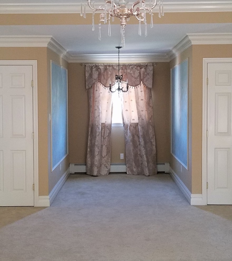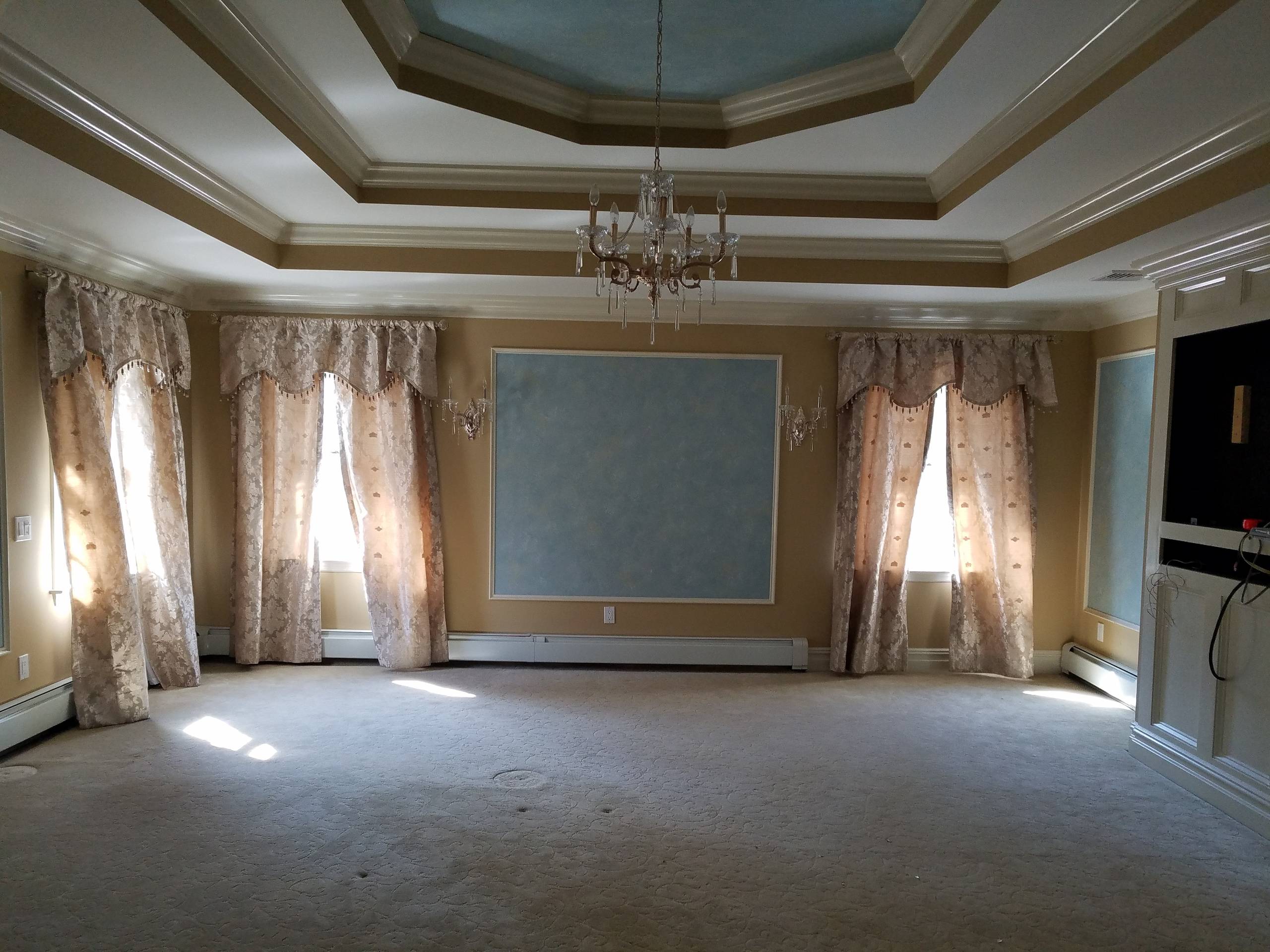 Before: Here’s a look at the original bedroom. In addition to the color scheme and ballroom feel, Miller and Bruno felt the frilly curtains, old-school chandelier and worn out wall-to-wall carpet had to go. “It felt dark and heavy,” Campana says. “They have a beautiful spacious backyard and wanted as much light as possible in this room.”