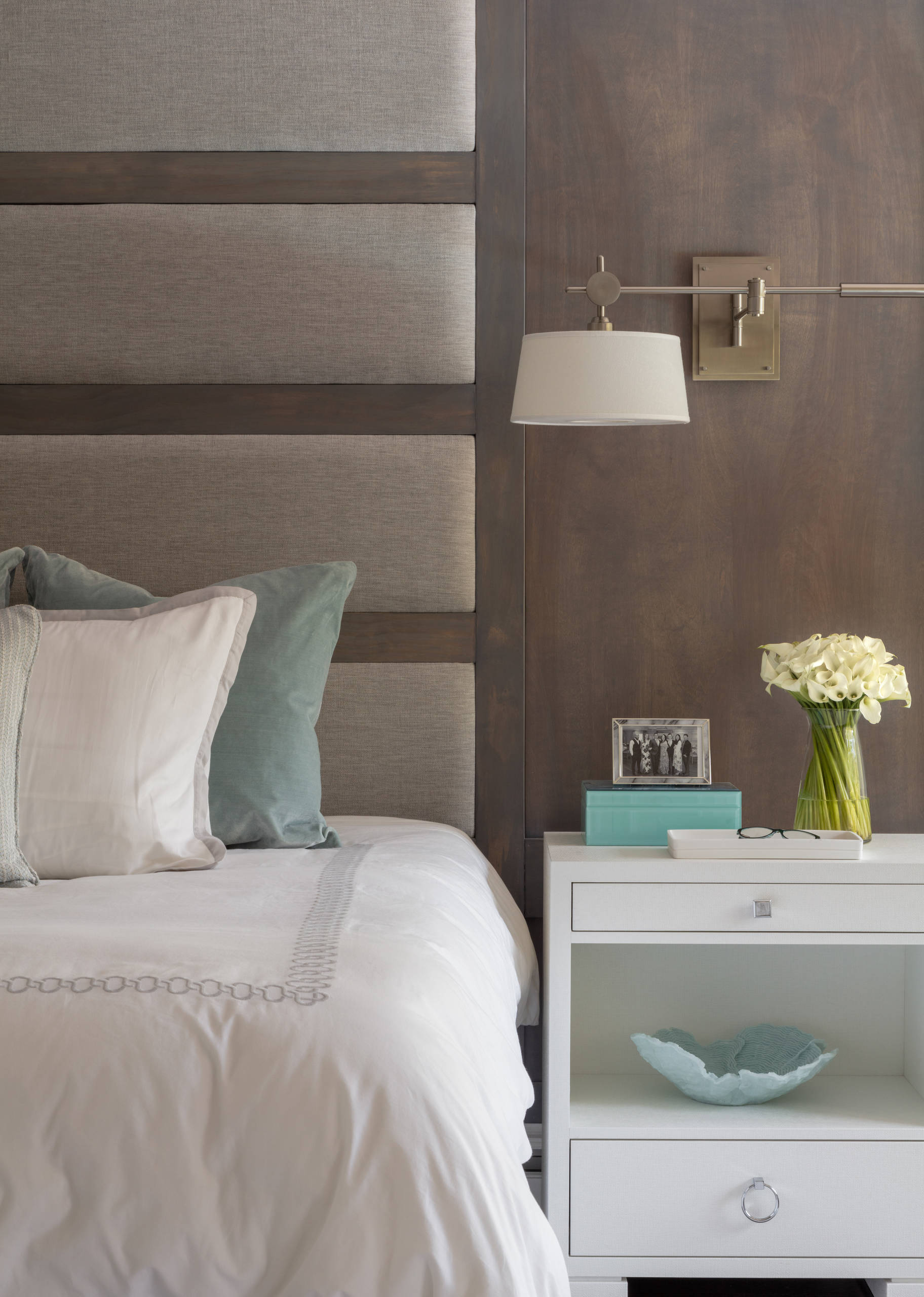 Adjustable wall sconces with a swing arm allow the couple to read comfortably in bed. White side tables feature a lacquered grasscloth finish for a touch of texture. “I love these nightstands,” Miller says. “They’re fashionably understated but highly functional.”